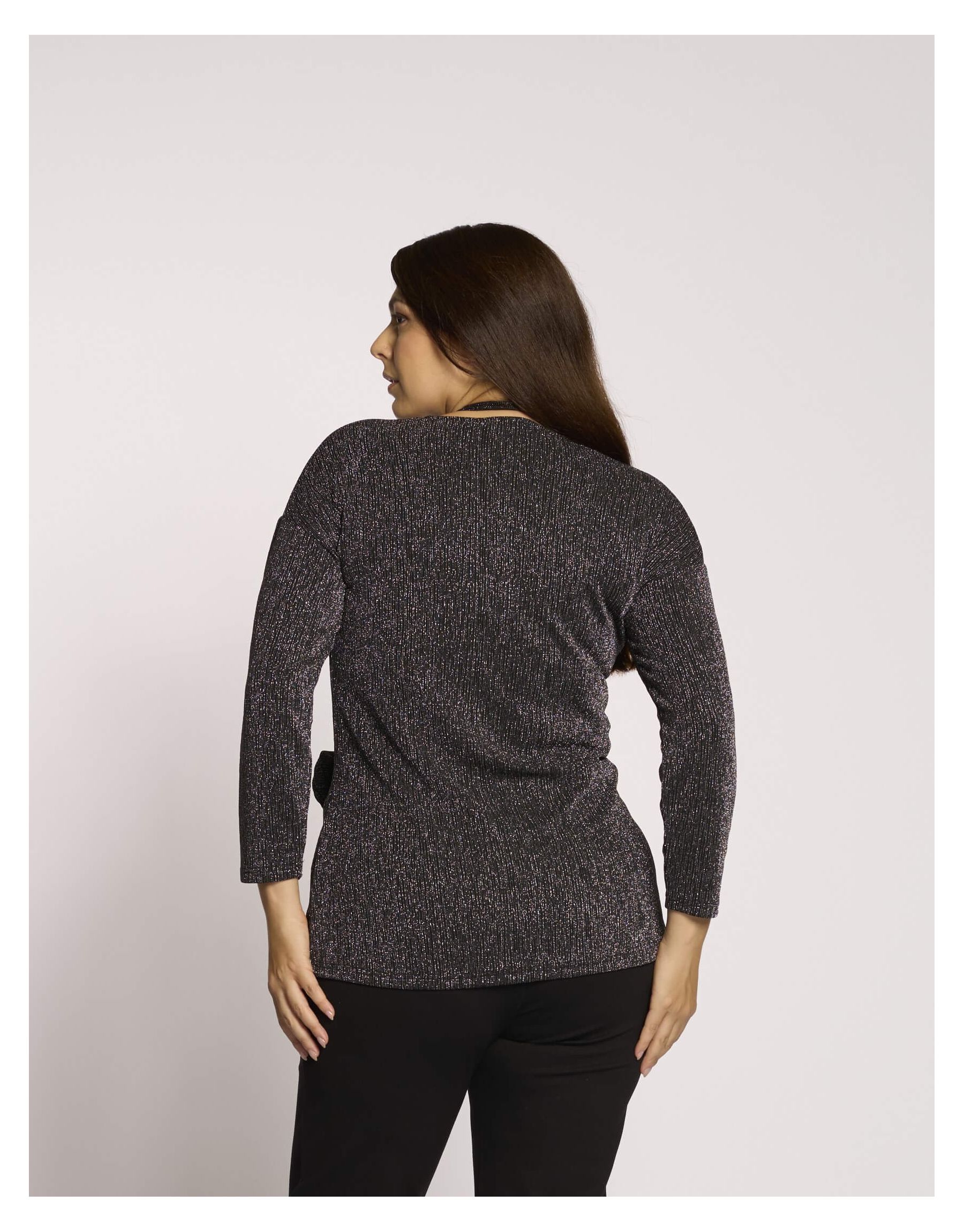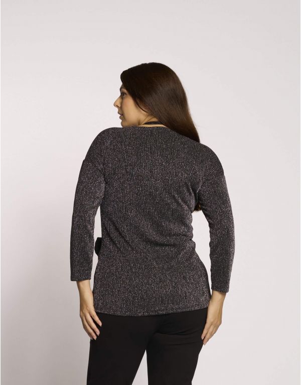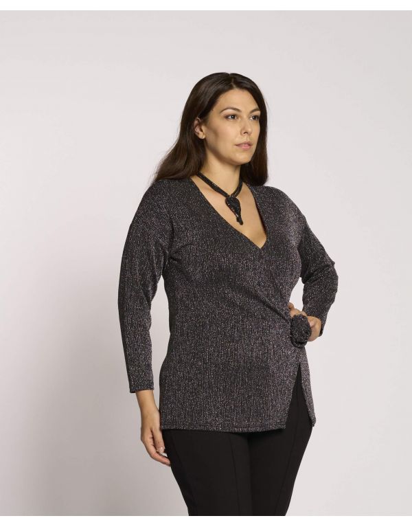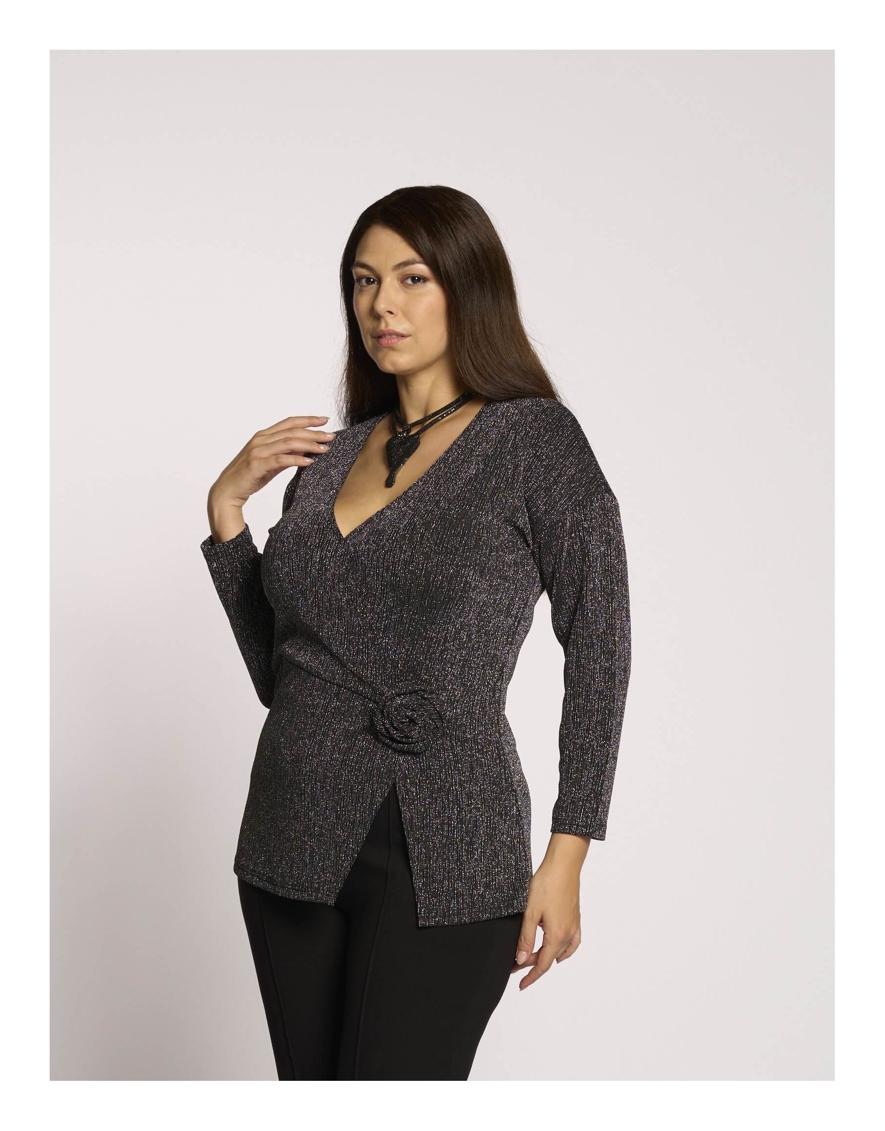 T-shirt incrociata in jersey lurex con spacco e fiore applicato