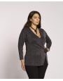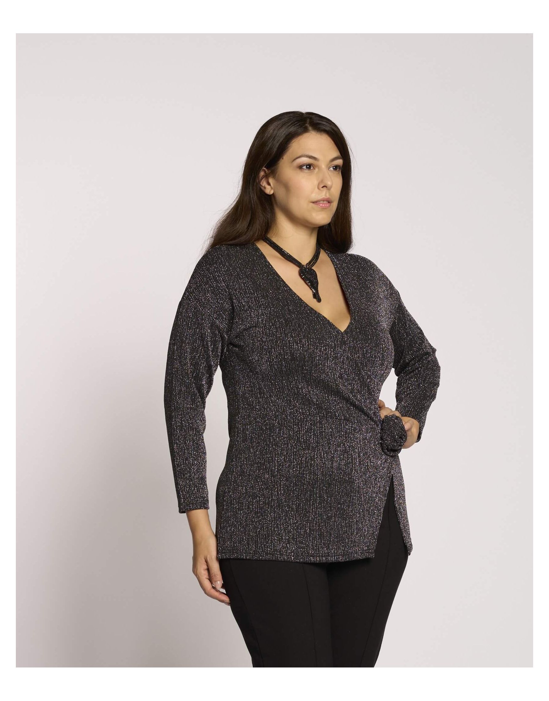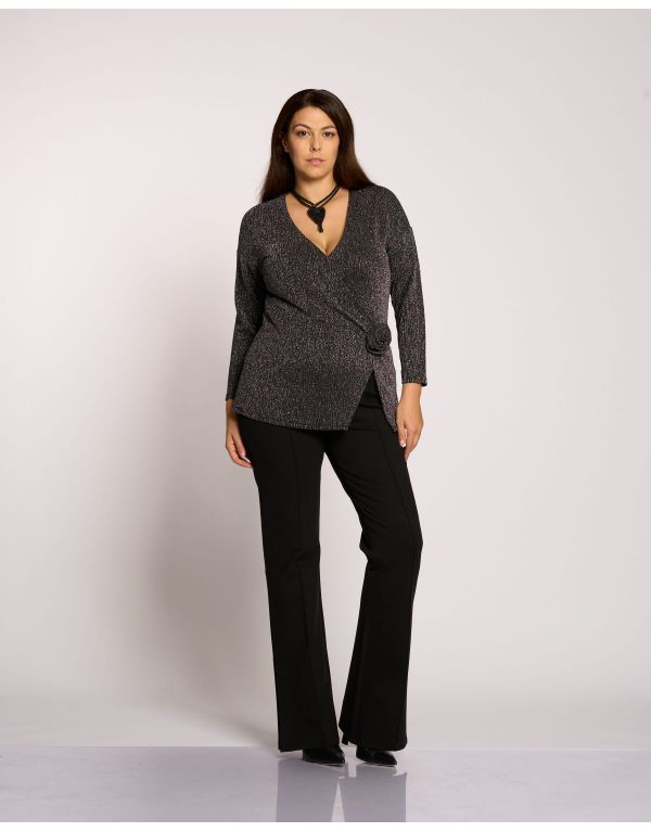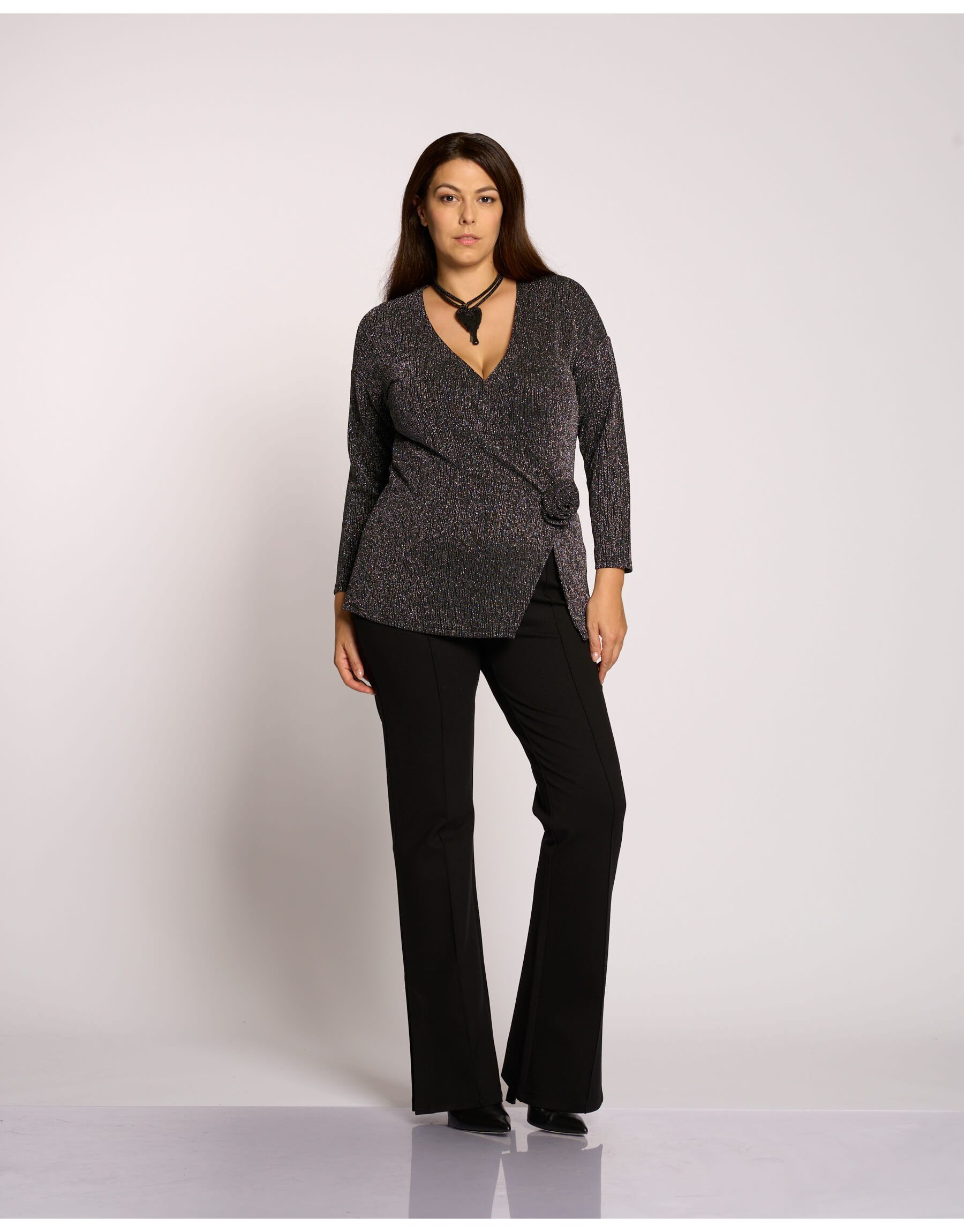 Questa maglia incrociata in jersey lurex unisce comfort e glamour, grazie al tessuto brillante che cattura la luce ad ogni movimento. L'elegante scollo a V incrociato valorizza la figura, mentre lo spacco laterale aggiunge un dettaglio elegante; il fiore applicato funge da dettaglio romantico e sofisticato, trasformando un capo base in una dichiarazione di stile.