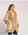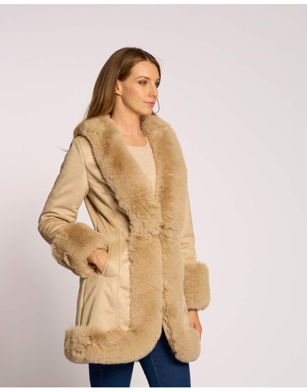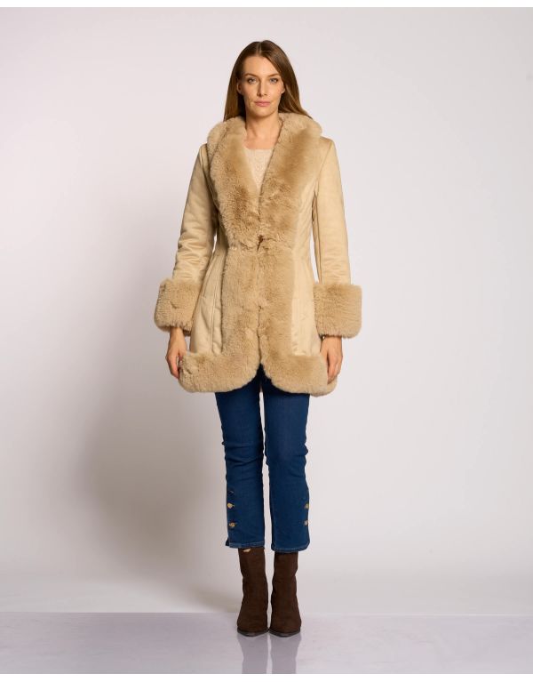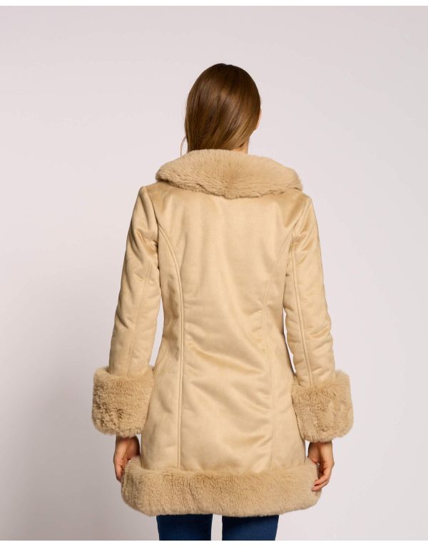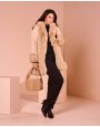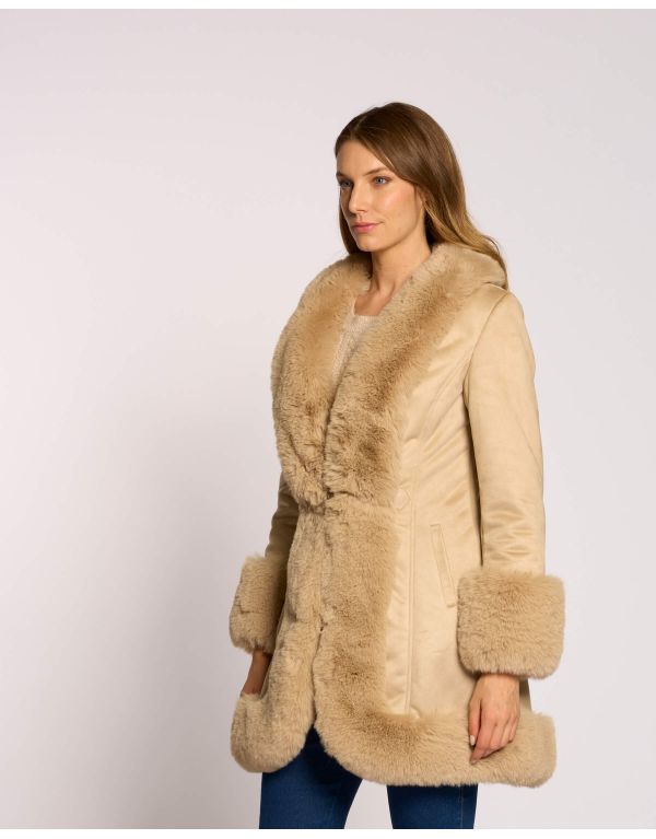Questo elegante cappotto è realizzato in caldo e morbido ecomontone. Presenta un design distintivo con un fondo stondato che aggiunge un tocco di originalità. La chiusura è caratterizzata da un alamaro e pratici ganci, combinando stile e funzionalità.