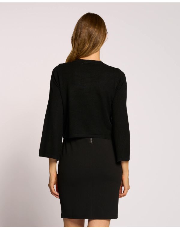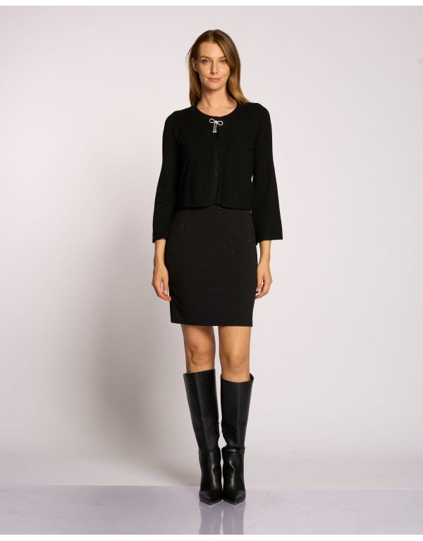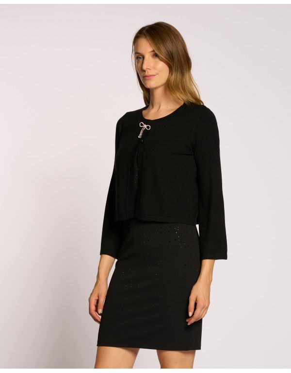 Questo bolerino in maglia è il capo perfetto per aggiungere un tocco di eleganza discreta sopra abiti o top, offrendo una copertura leggera e raffinata. Il suo design semplice e versatile è impreziosito da una spilla gioiello, che funge da punto luce scintillante e sofisticato, elevando ogni outfit da giorno o da sera.