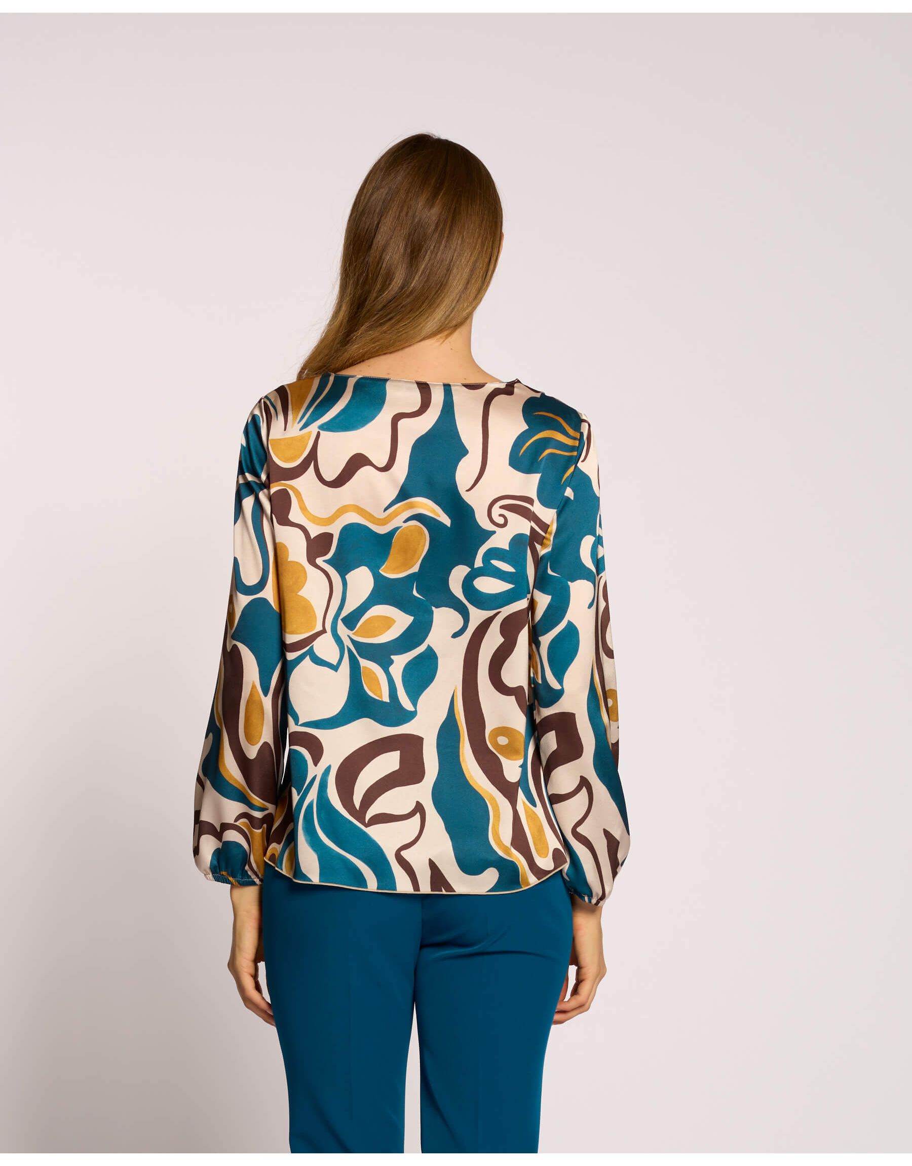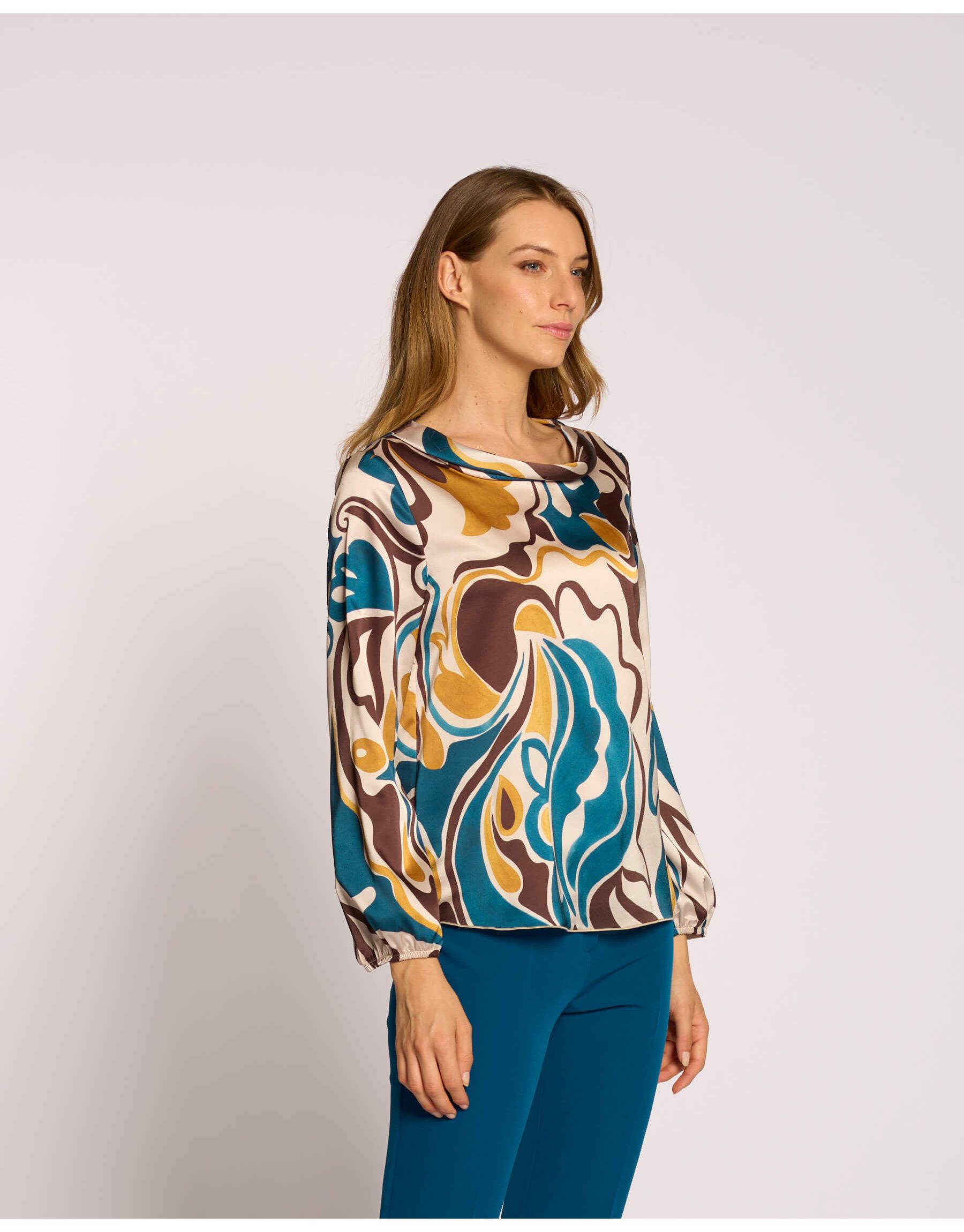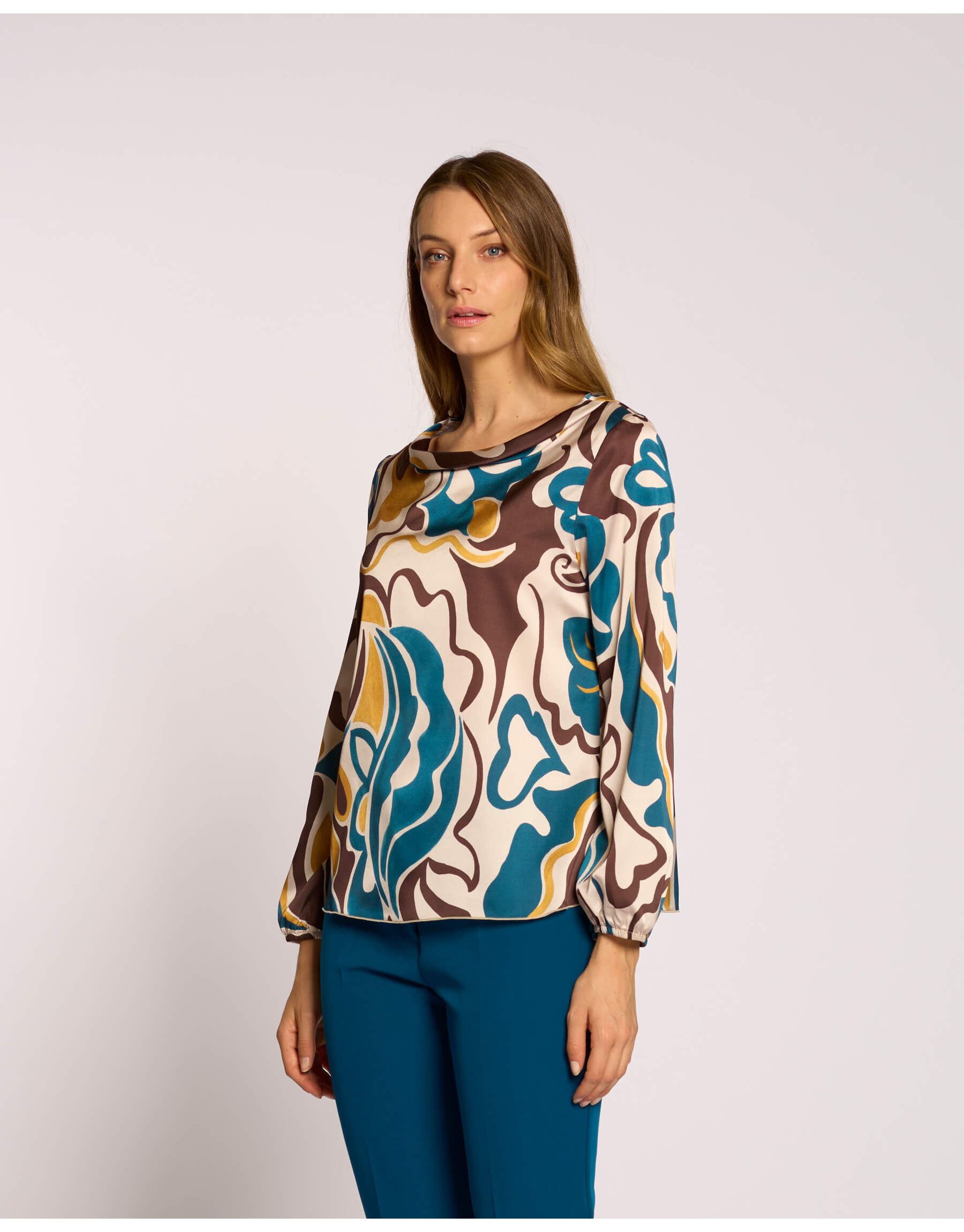 Distinguiti con stile indossando questa casacca lunga in raso fantasia, un capo che unisce eleganza e comfort. Il raffinato collo ad anello drappeggia morbidamente, aggiungendo un tocco di sofisticata fluidità al design. Perfetta per ogni occasione, questa casacca è ideale per creare un look ricercato e di grande impatto visivo.