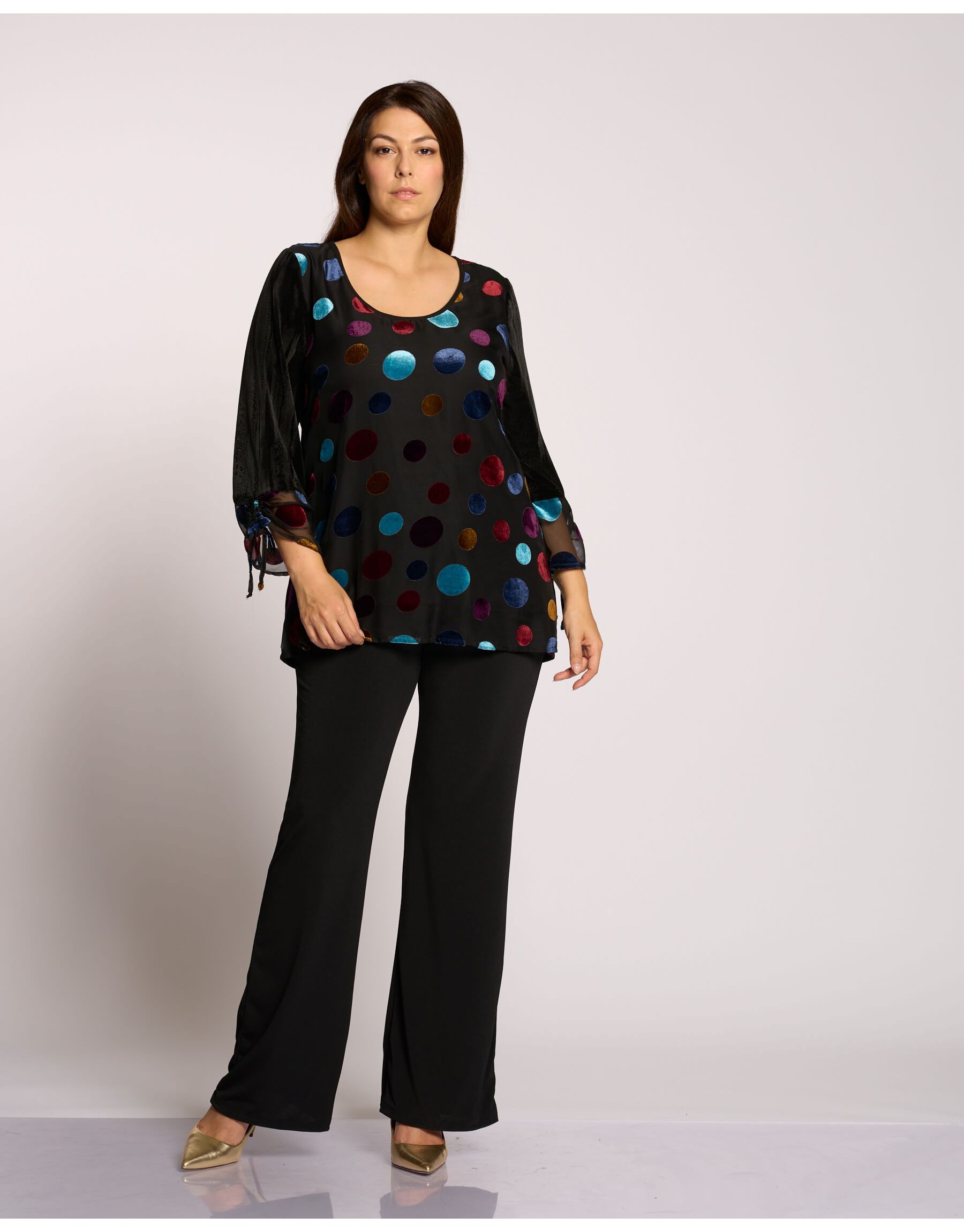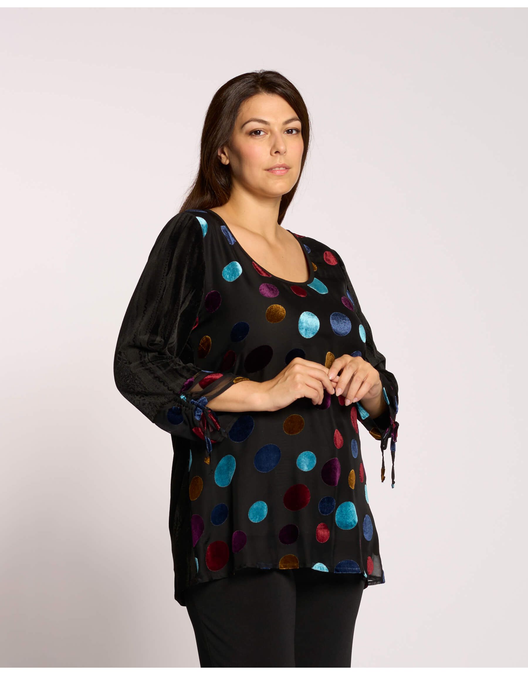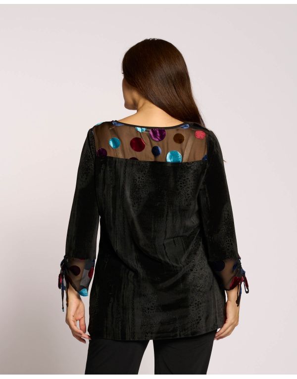 Indossa un tocco di eleganza e raffinatezza con questa casacca che unisce stili e texture diverse. Il corpo del capo è decorato da un raffinato motivo a pois floccati, mentre le maniche in morbido velluto aggiungono un tocco chic. I fiocchi sui polsi completano il design con un dettaglio femminile, rendendo questa casacca perfetta per un'occasione speciale.