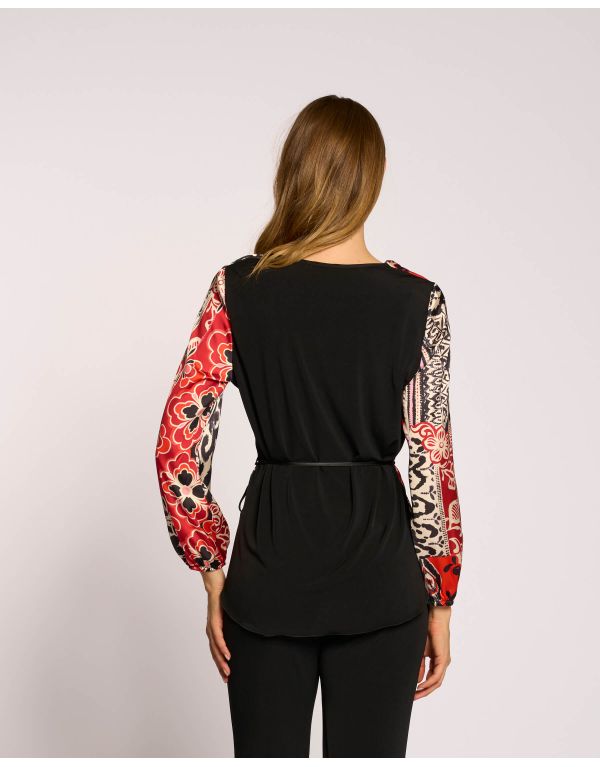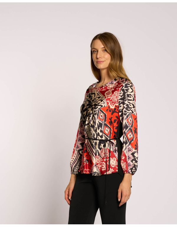 Casacca lunga in raso fantasia con schiena in maglia e cinturina