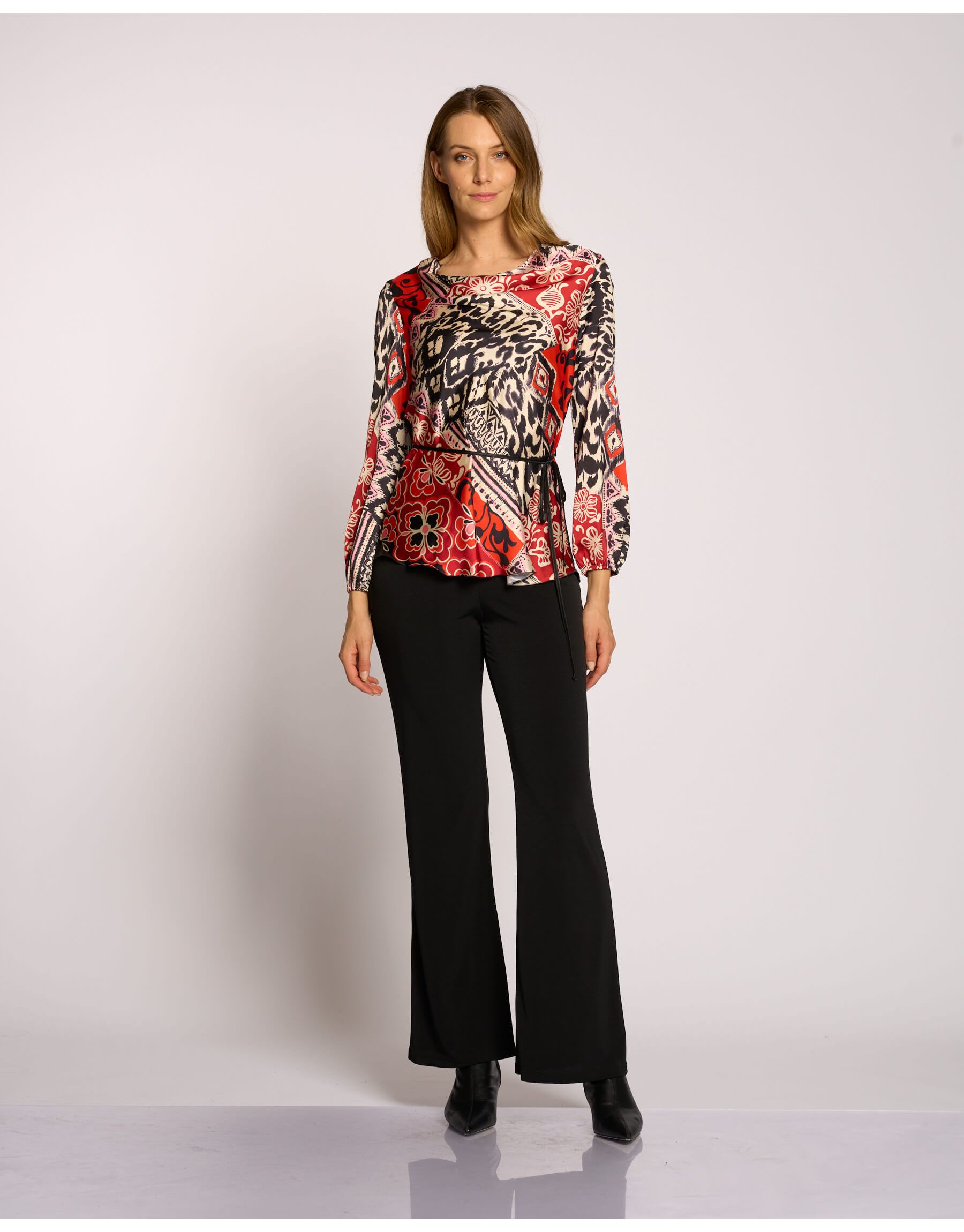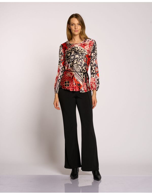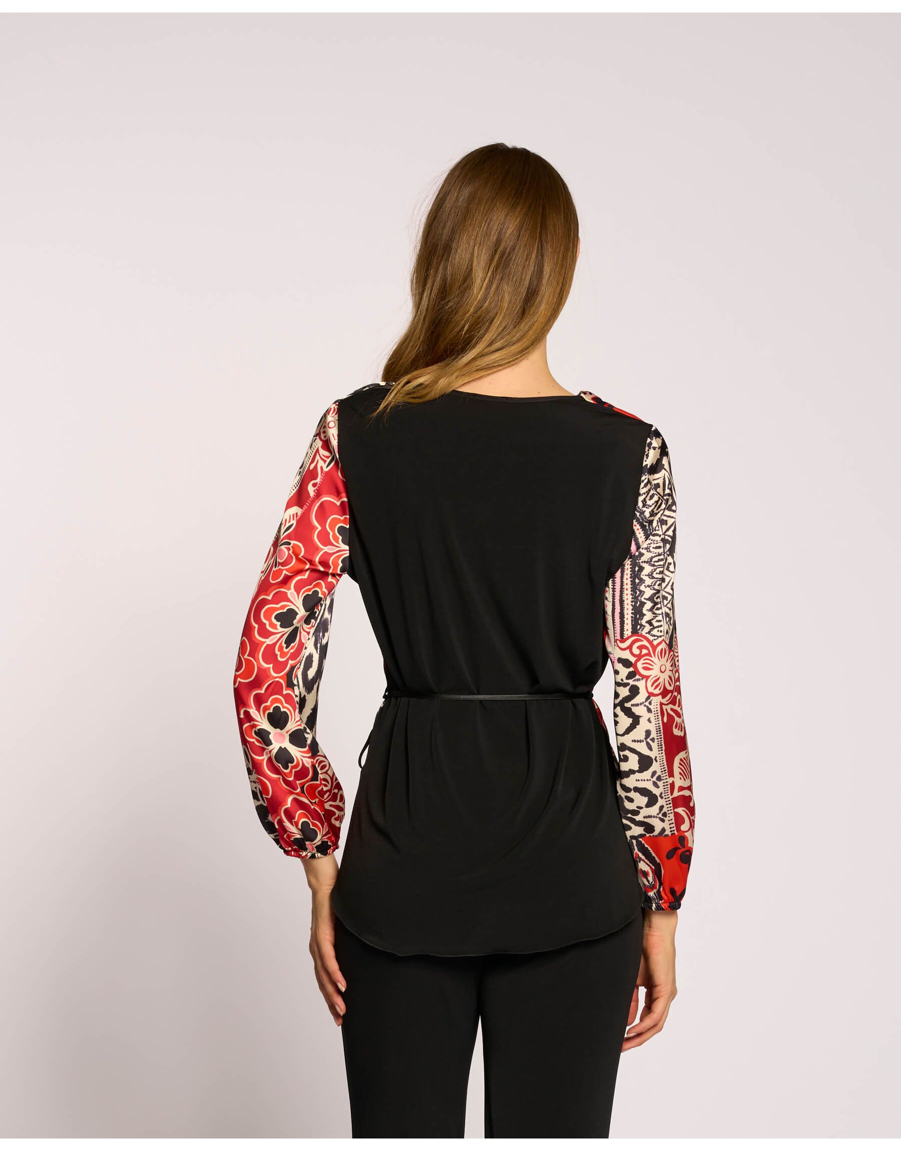 Questa casacca unisce la leggerezza del raso stampato sulla parte anteriore con il comfort della maglia sulla schiena. Il taglio lungo e la cinturina coordinata valorizzano la figura, rendendola un capo elegante e pratico, perfetto per un look sofisticato ma comodo.