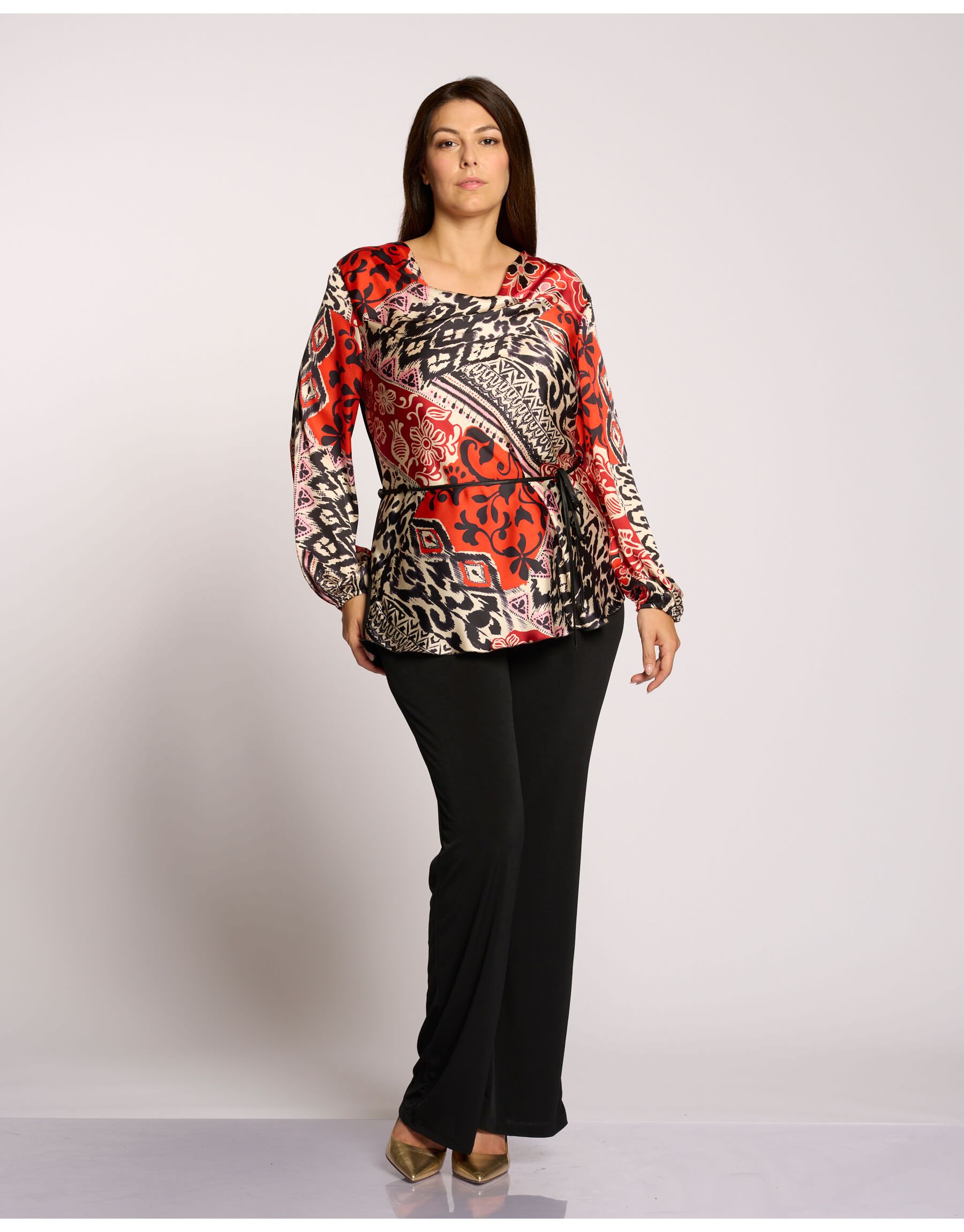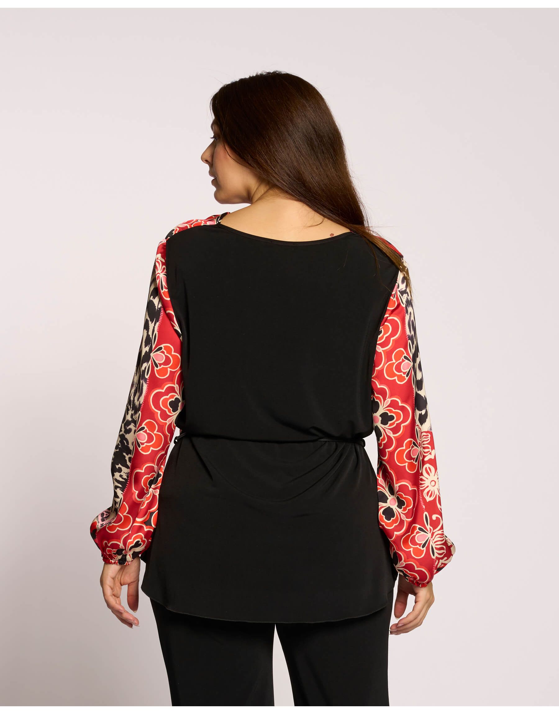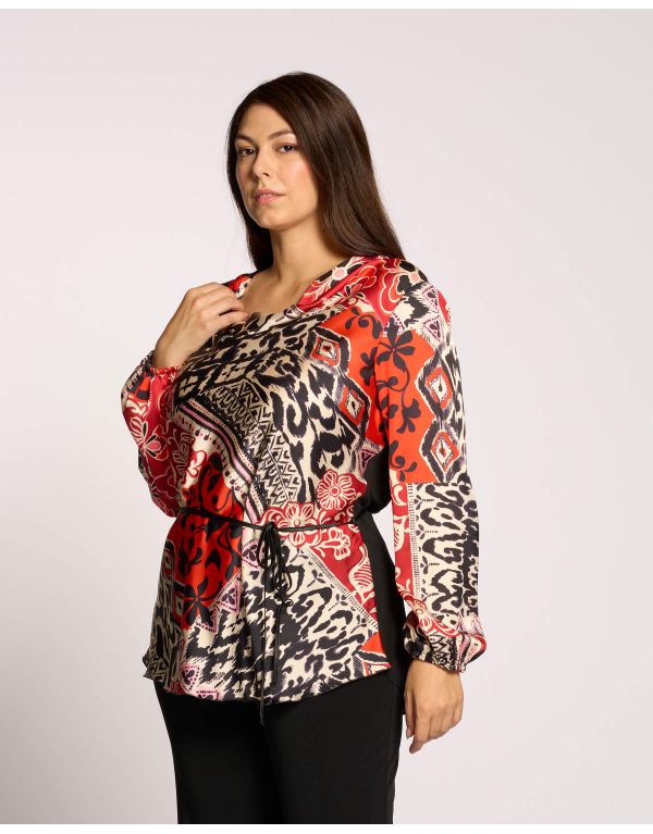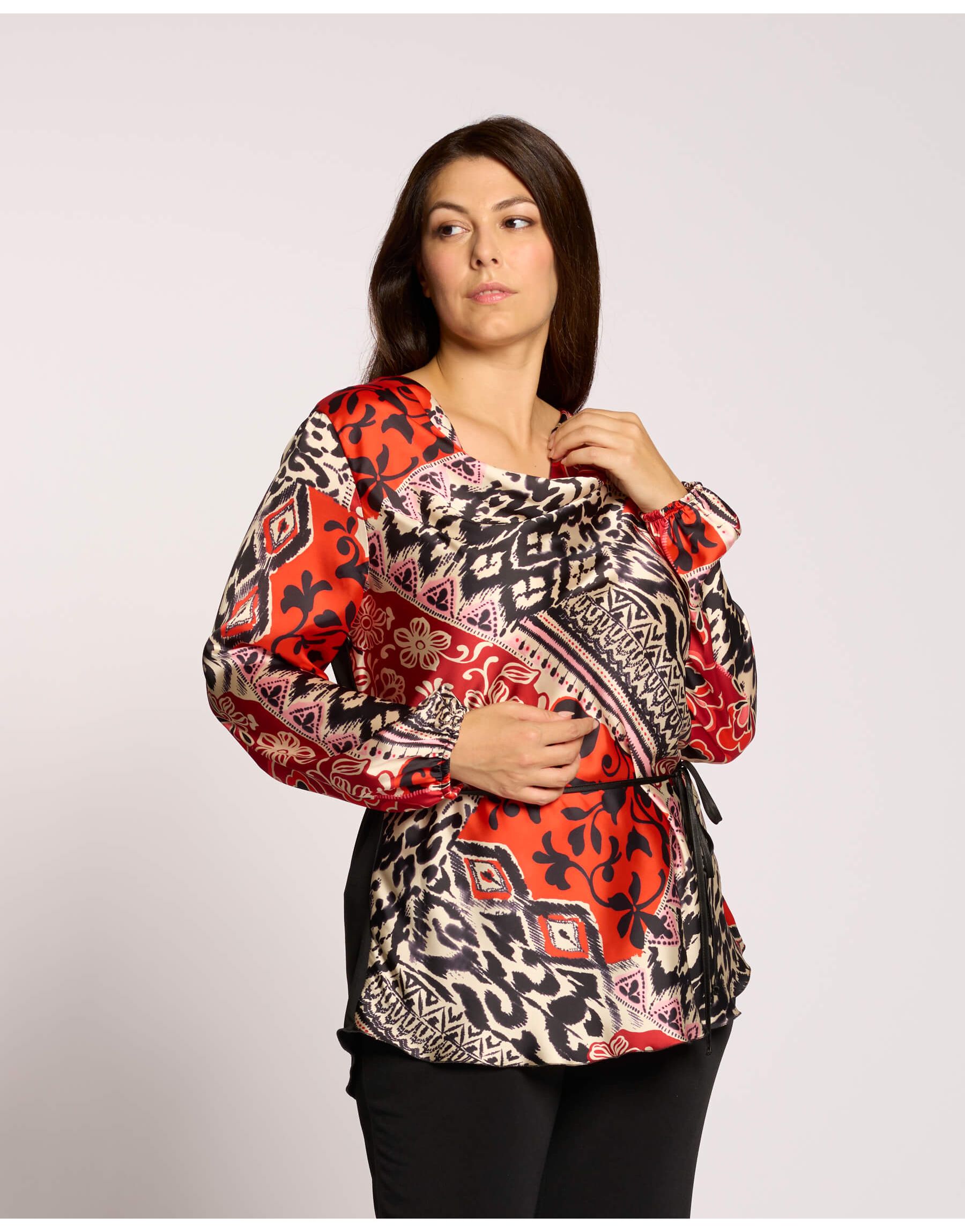 Questa casacca unisce la leggerezza del raso stampato sulla parte anteriore con il comfort della maglia sulla schiena. Il taglio lungo e la cinturina coordinata valorizzano la figura, rendendola un capo elegante e pratico, perfetto per un look sofisticato ma comodo.