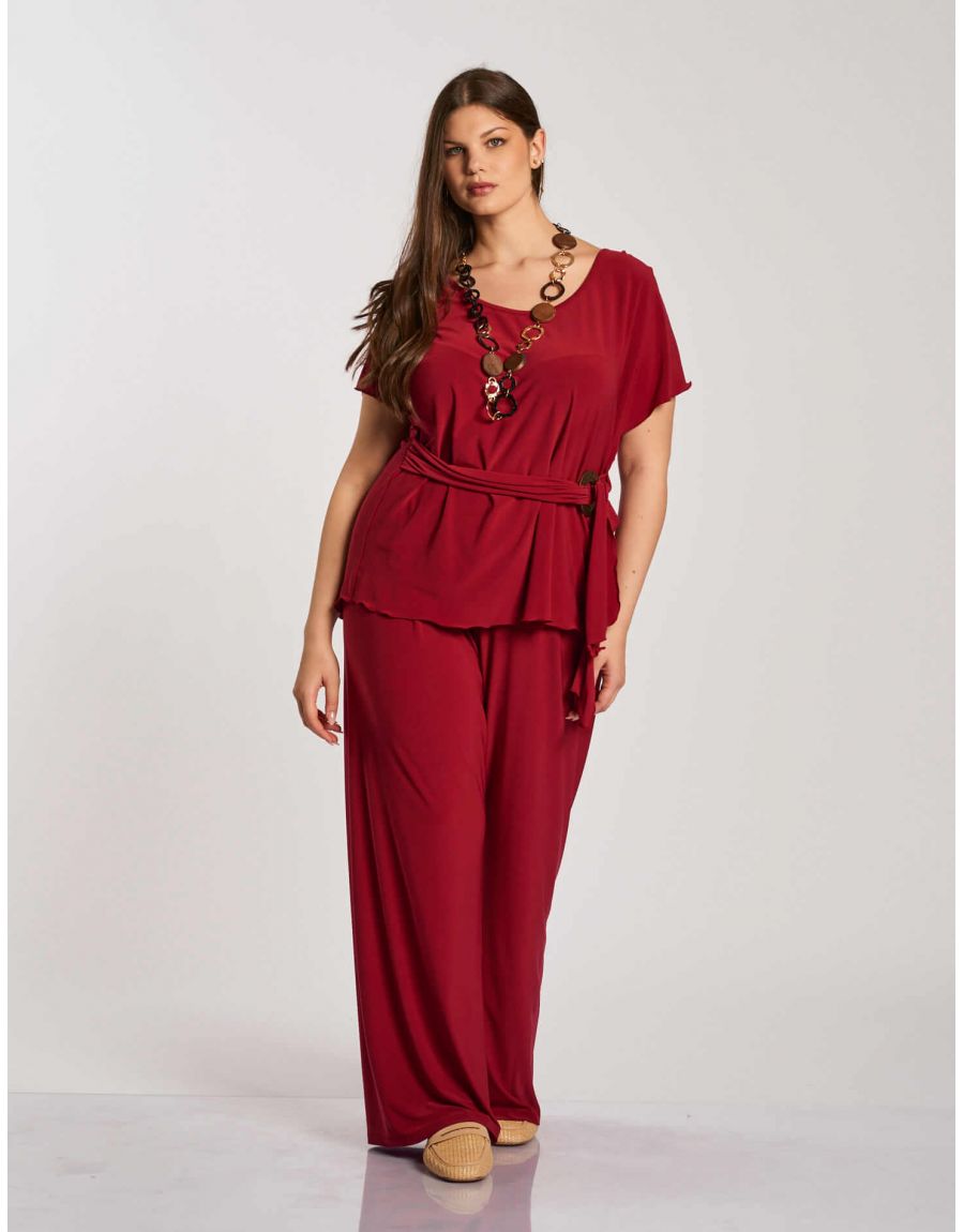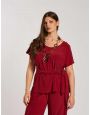 Una casacca in jersey con un dettaglio di pieghe sulle spalle che aggiungono un tocco strutturato, completata da una cinturina regolabile in vita con un anello e un laccio posteriore per definire la silhouette.