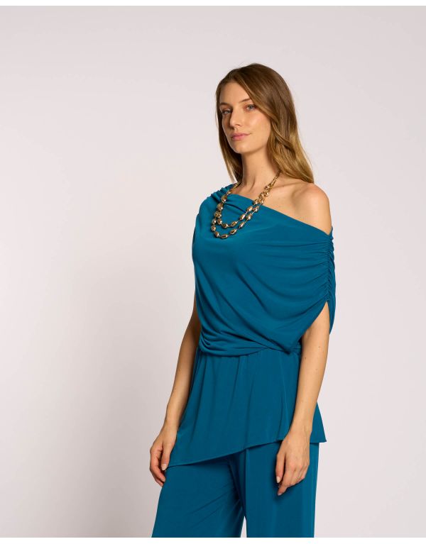 Questa casacca in jersey presenta un corpino drappeggiato che crea una silhouette elegante, completata da una baschina in vita per una vestibilità valorizzante. Realizzata in comodo tessuto jersey, è un capo versatile adatto a diverse occasioni.
