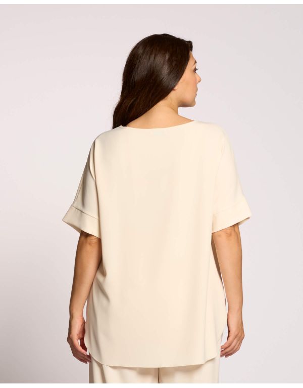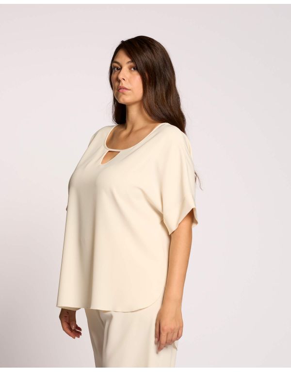 Casacca in cady fluido con oblò sullo scollo; più lunga sul lato posteriore