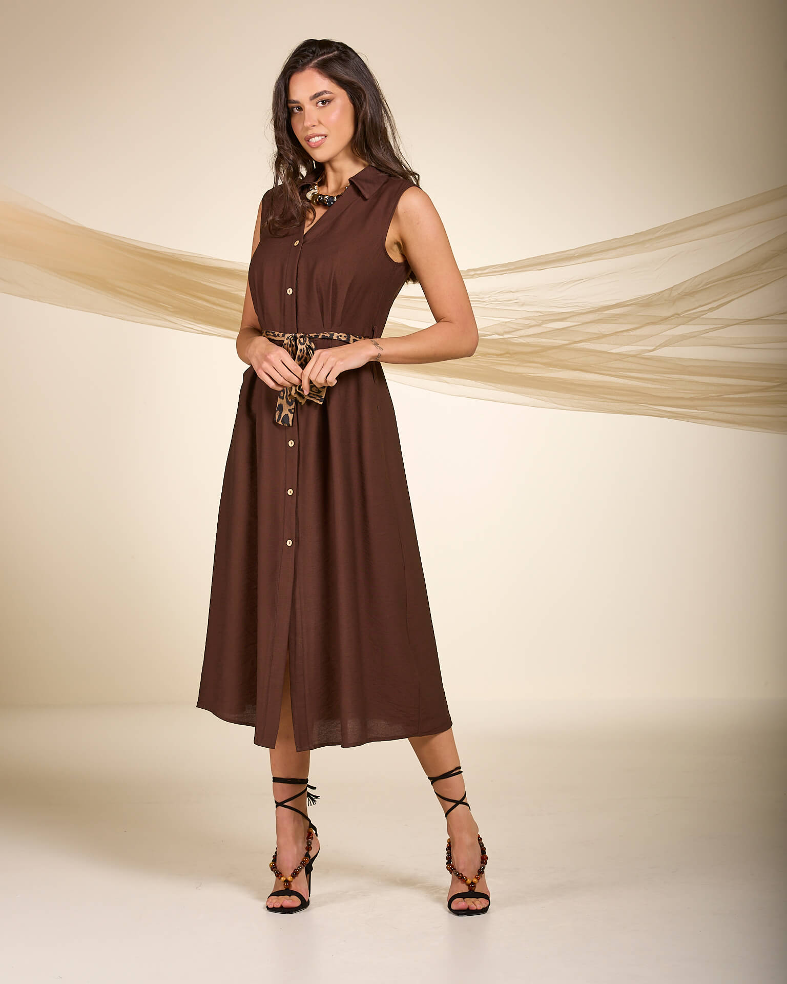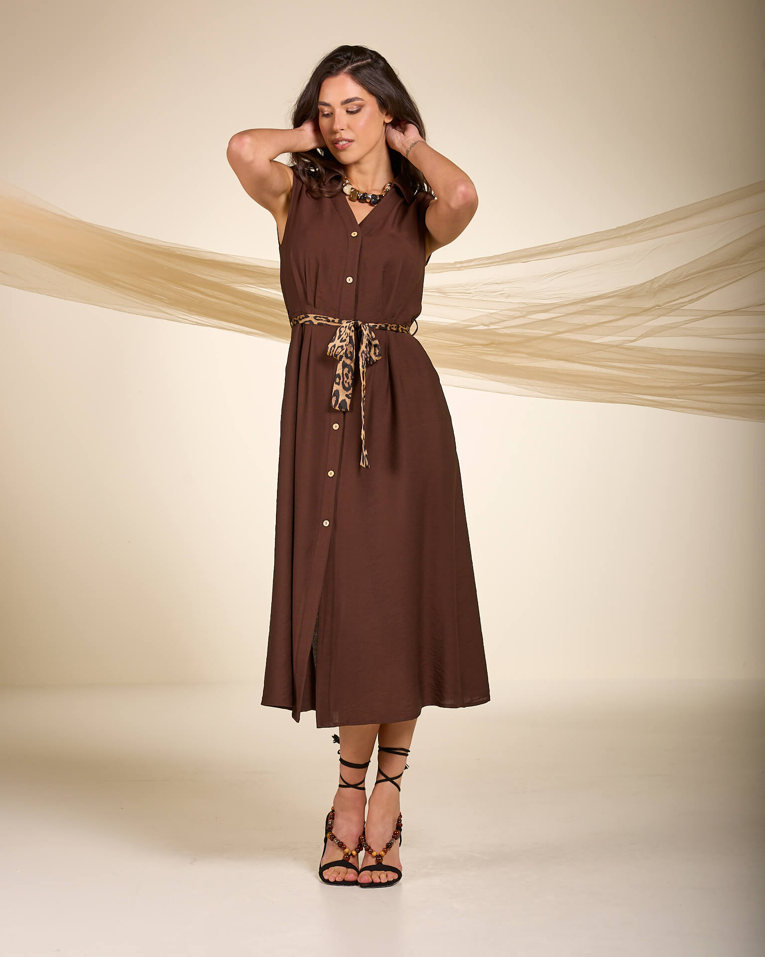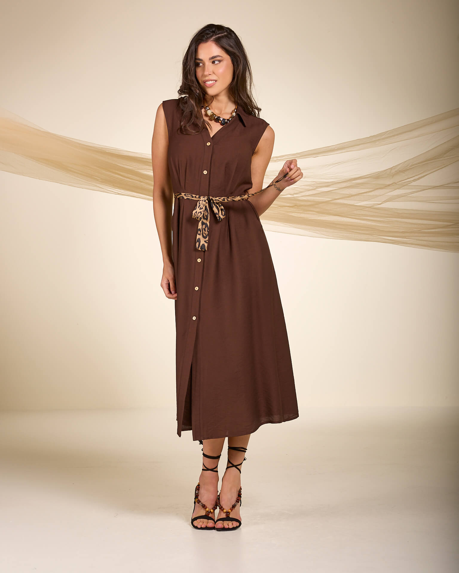 Vestito lungo chemisier con colletto e cinturina in raso maculata cioccolato