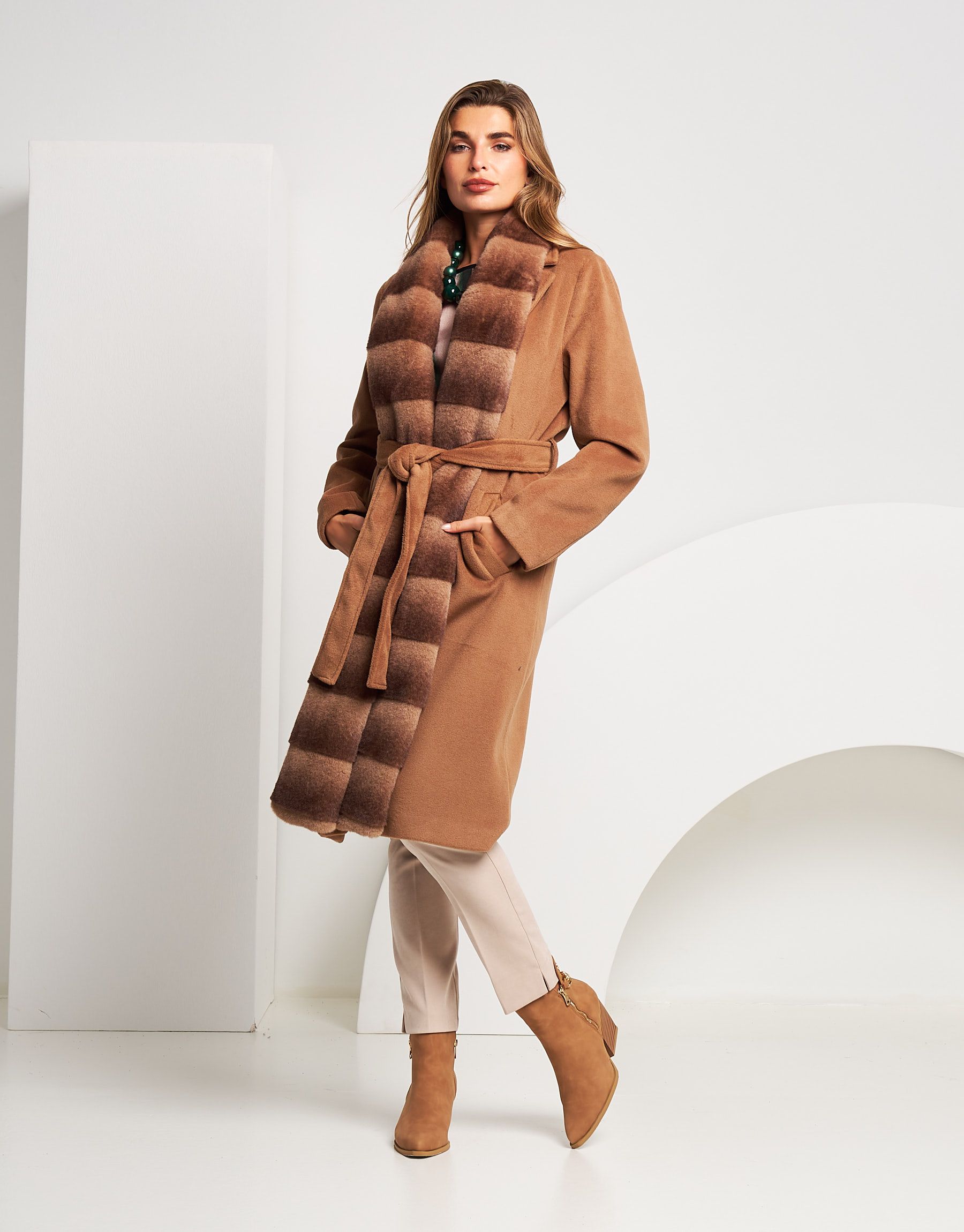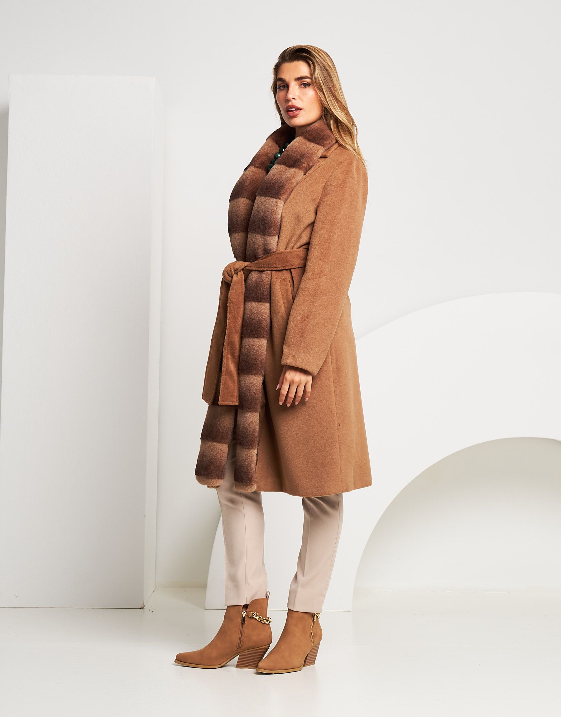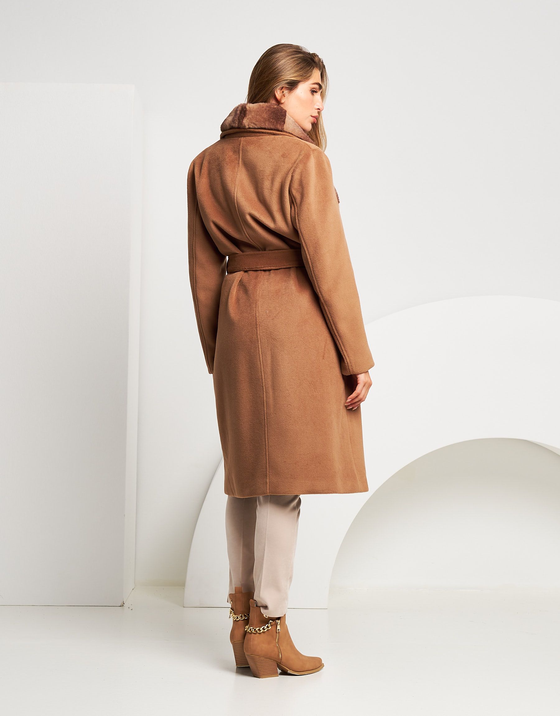 Cappotto lungo con bordo in ecopelliccia e cintura
