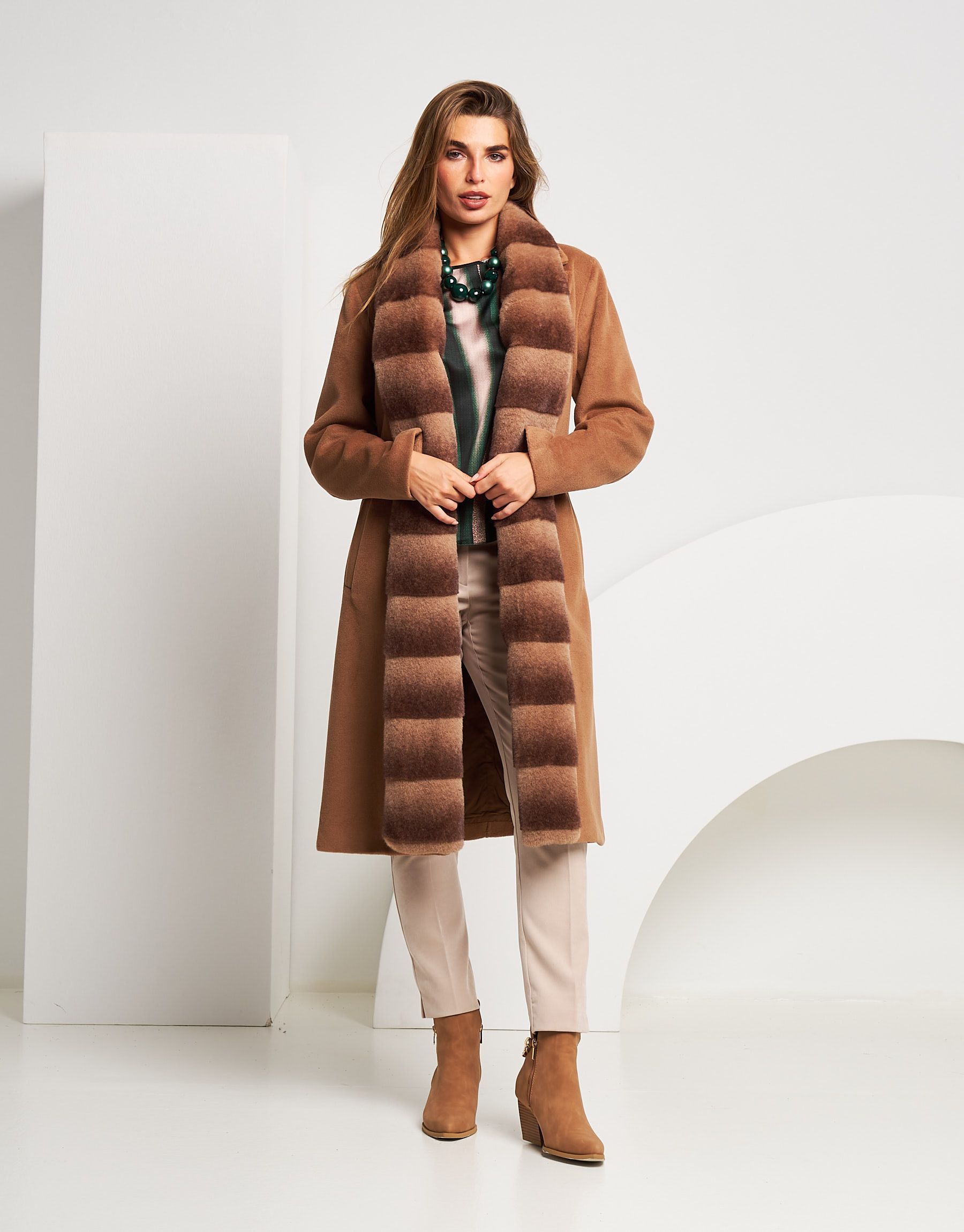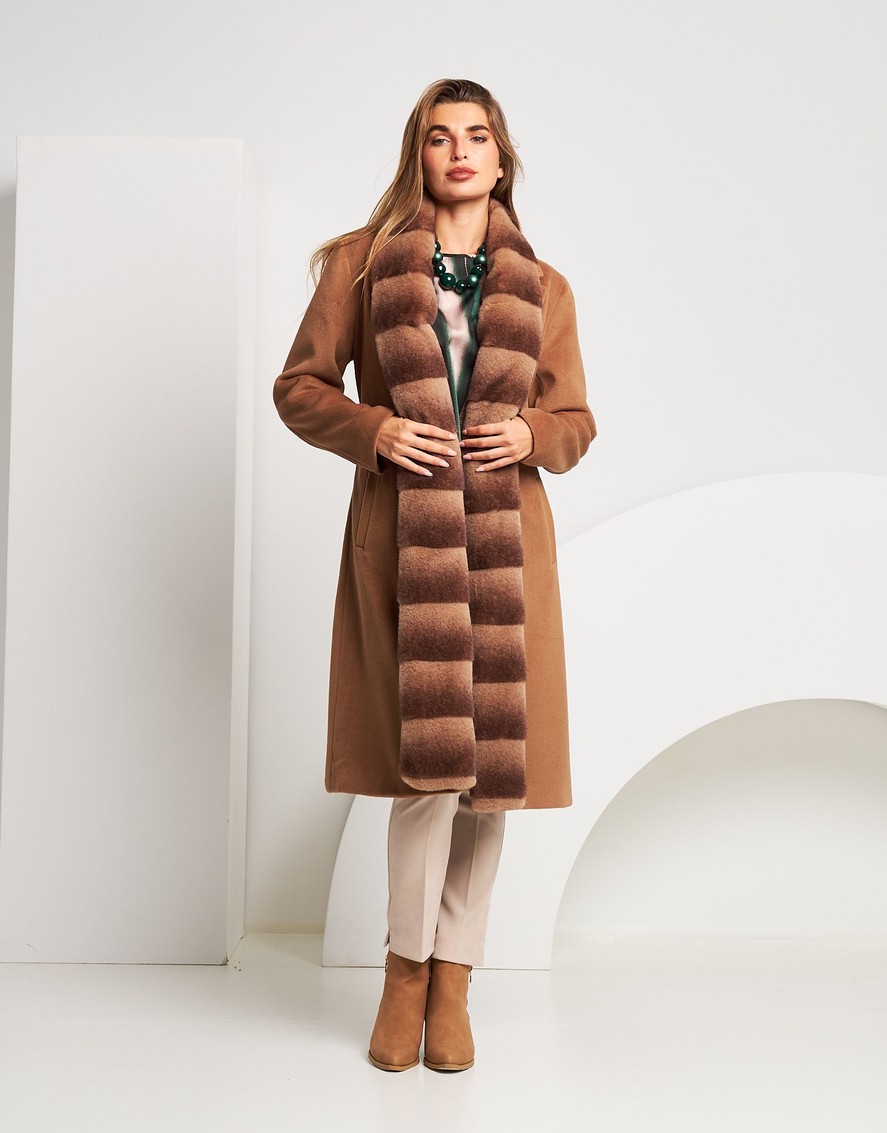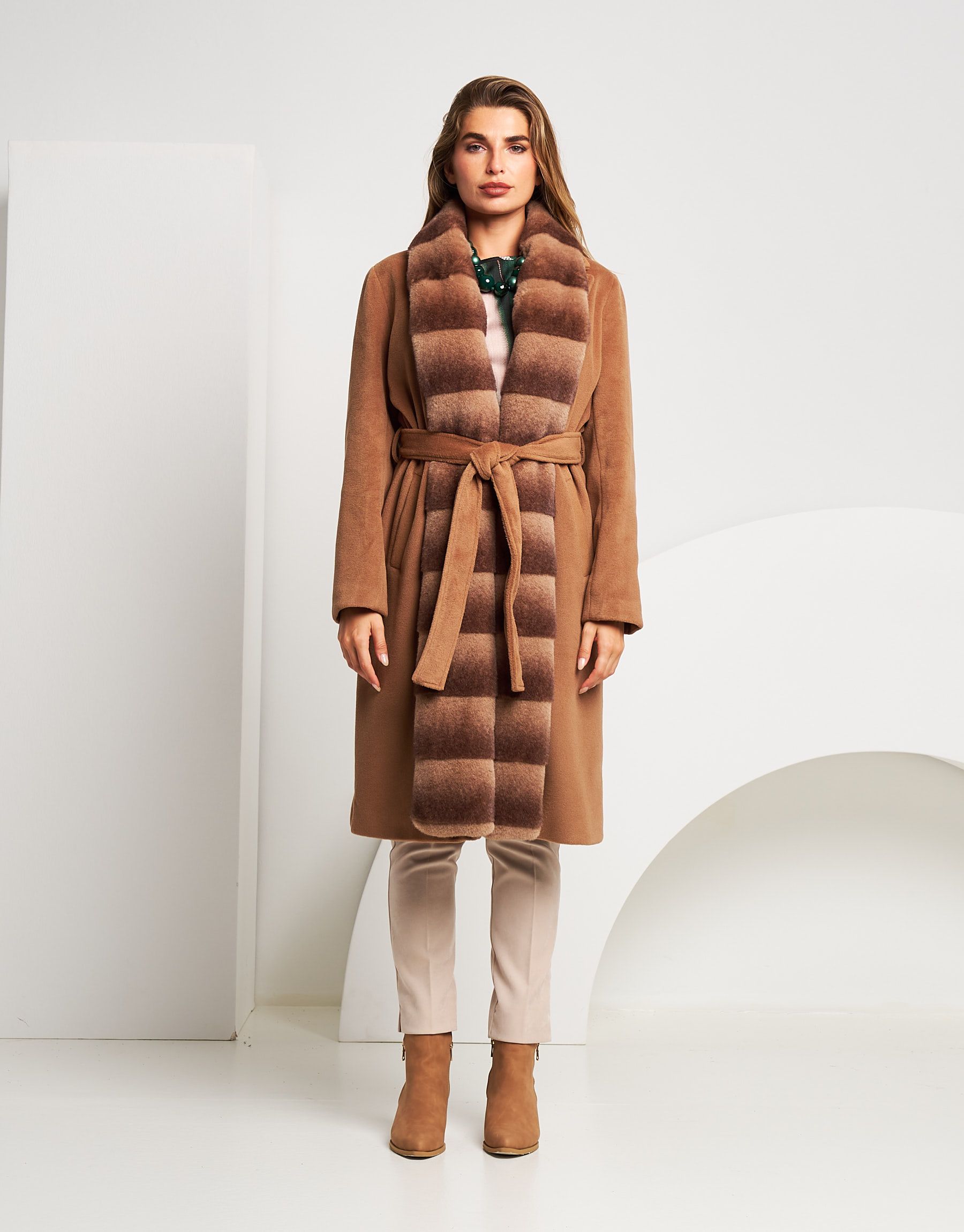 Cappotto lungo con bordo in ecopelliccia e cintura