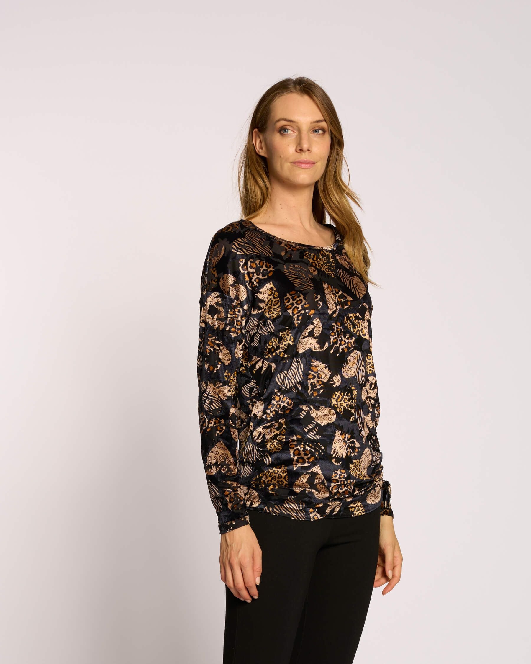 Maglia in ciniglia dévoré con coulisse sul fianco e arriccio ai polsi