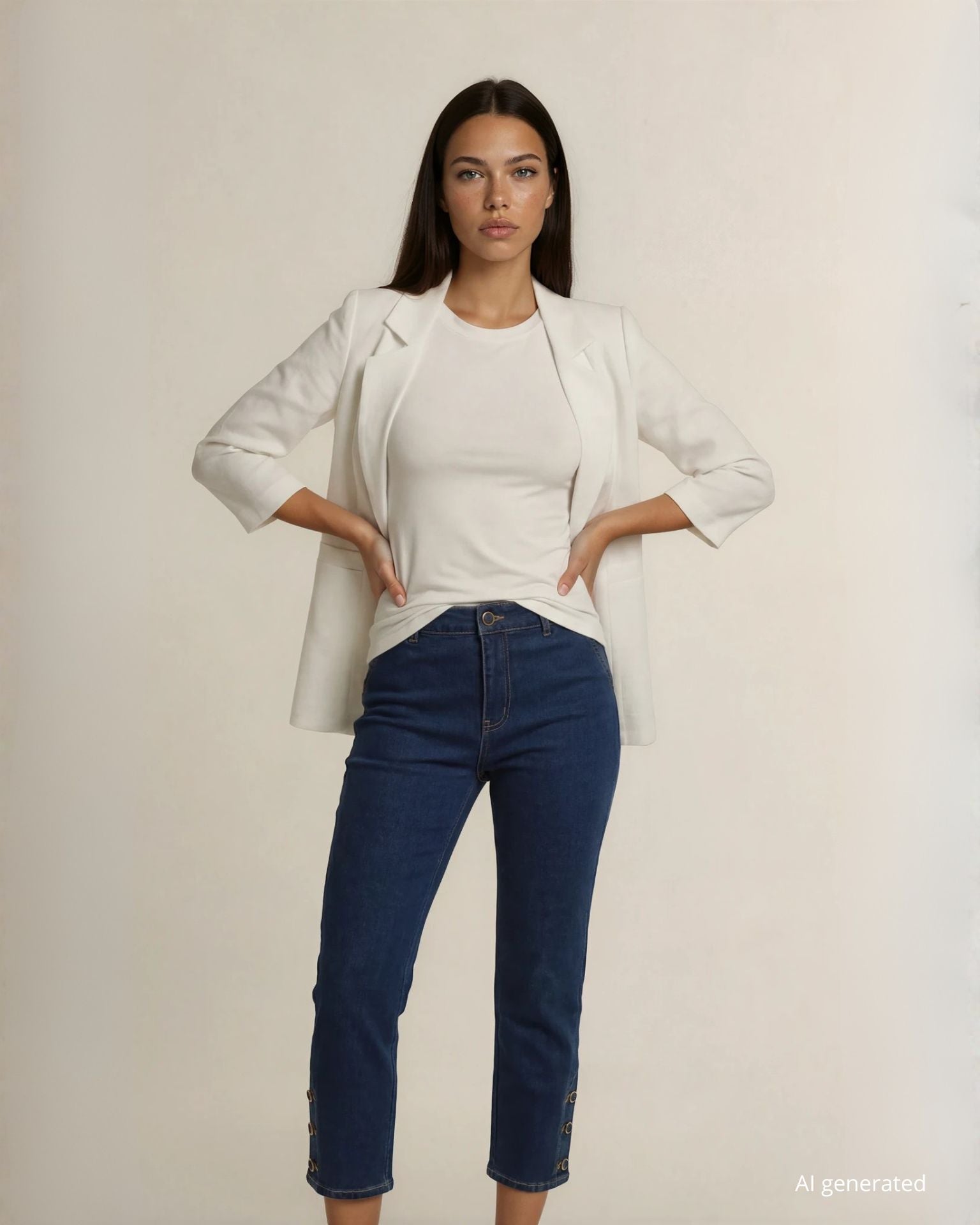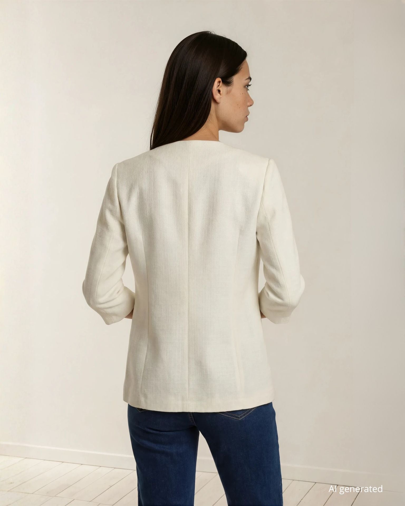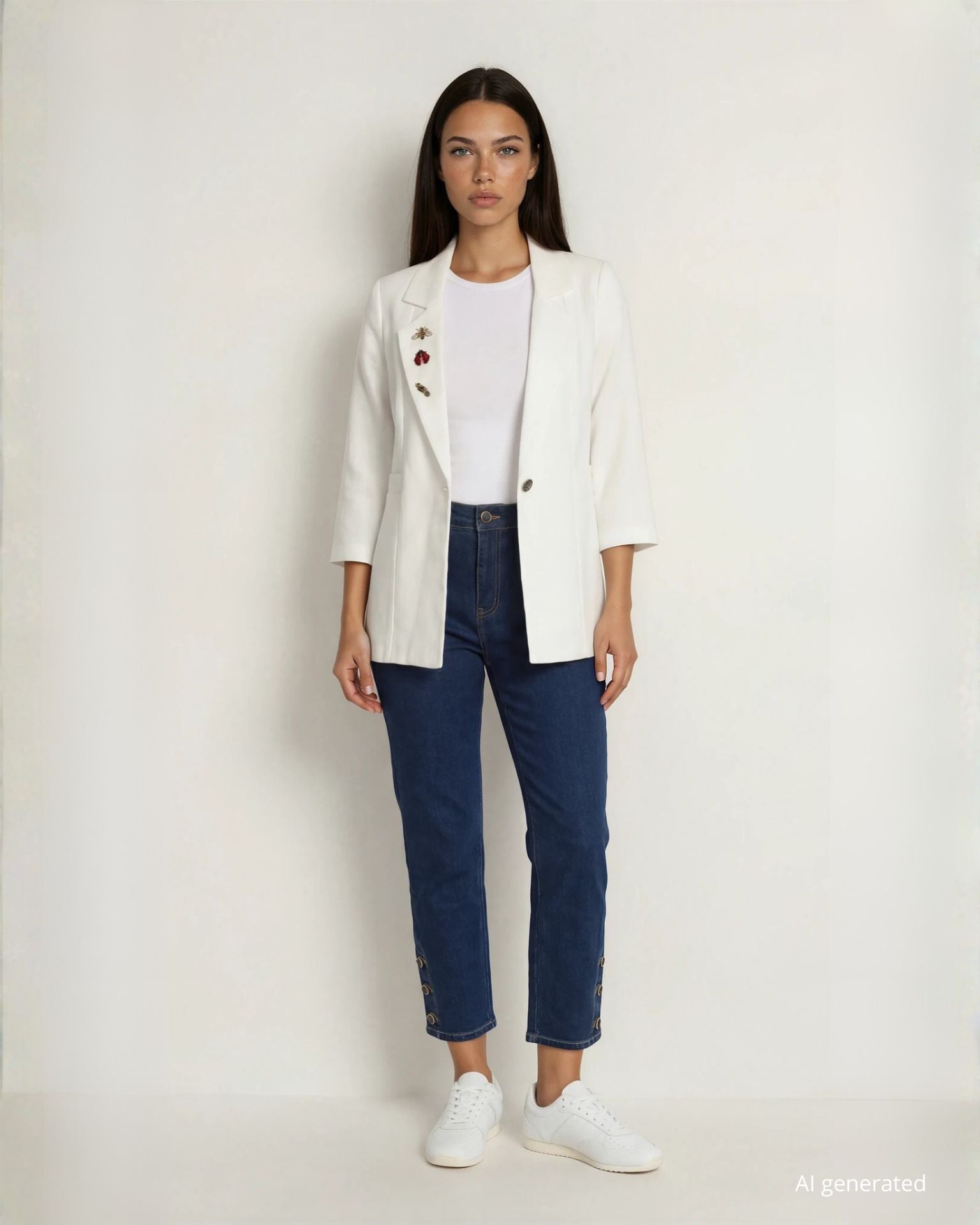 Giacca bianca simil lino con bottone centrale e dettagli di spille sul revers
