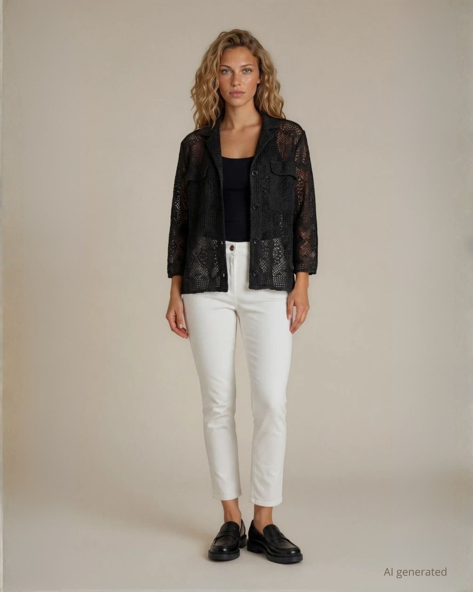 Giacca in pizzo revers con tasche e bottoni sul fronte nero
