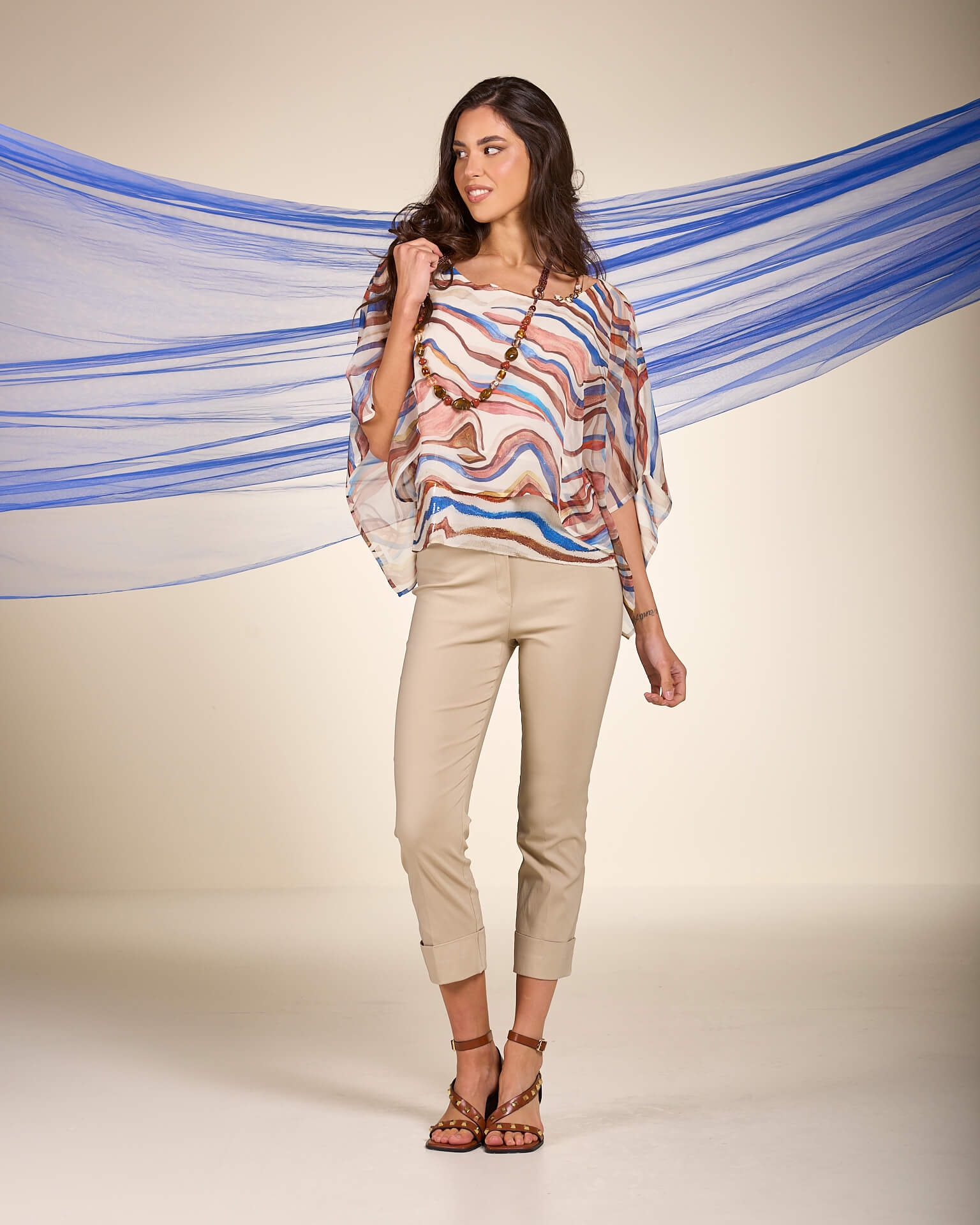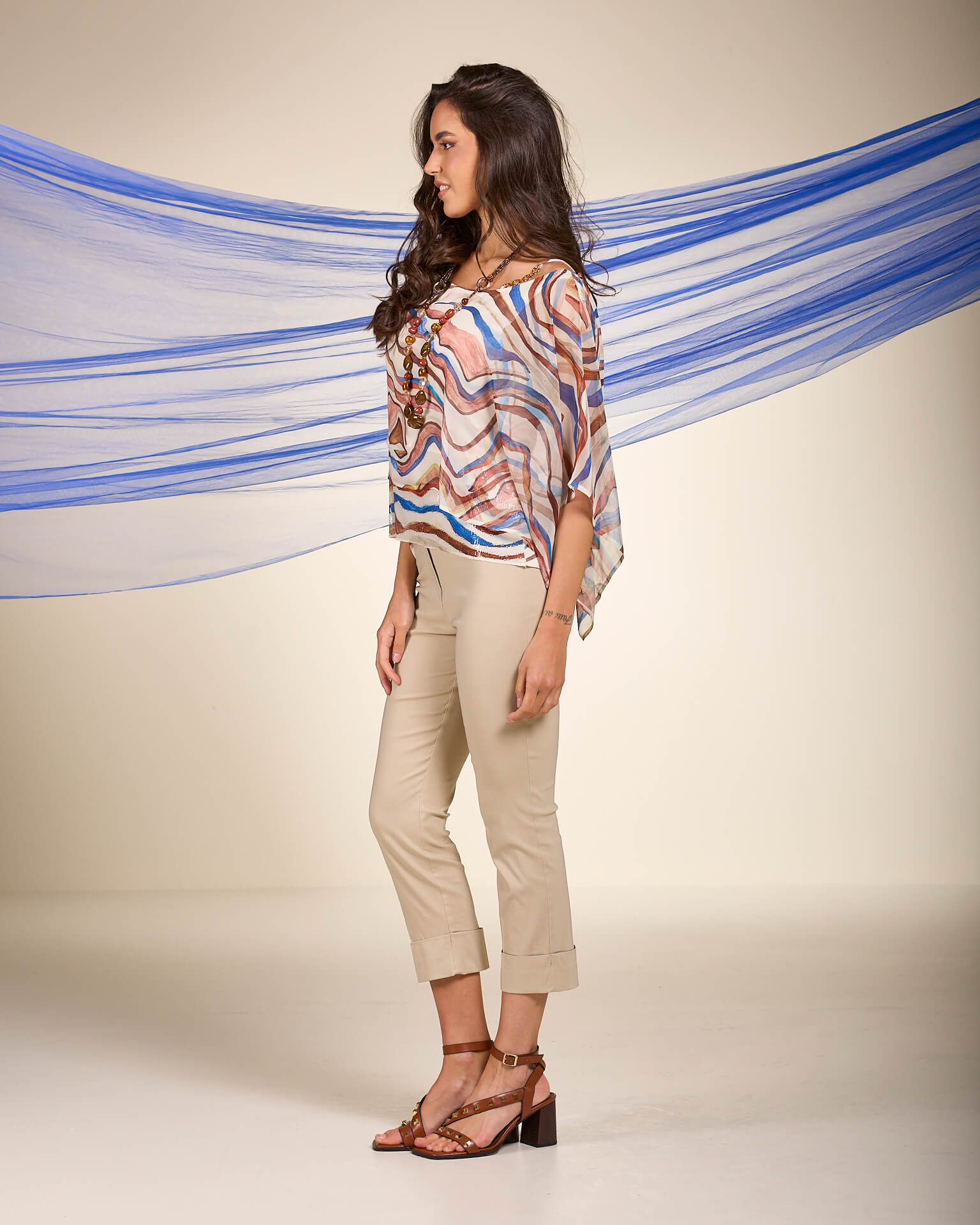 Poncho in georgette fantasia onde con spallina gioiello e paillettes sul fondo