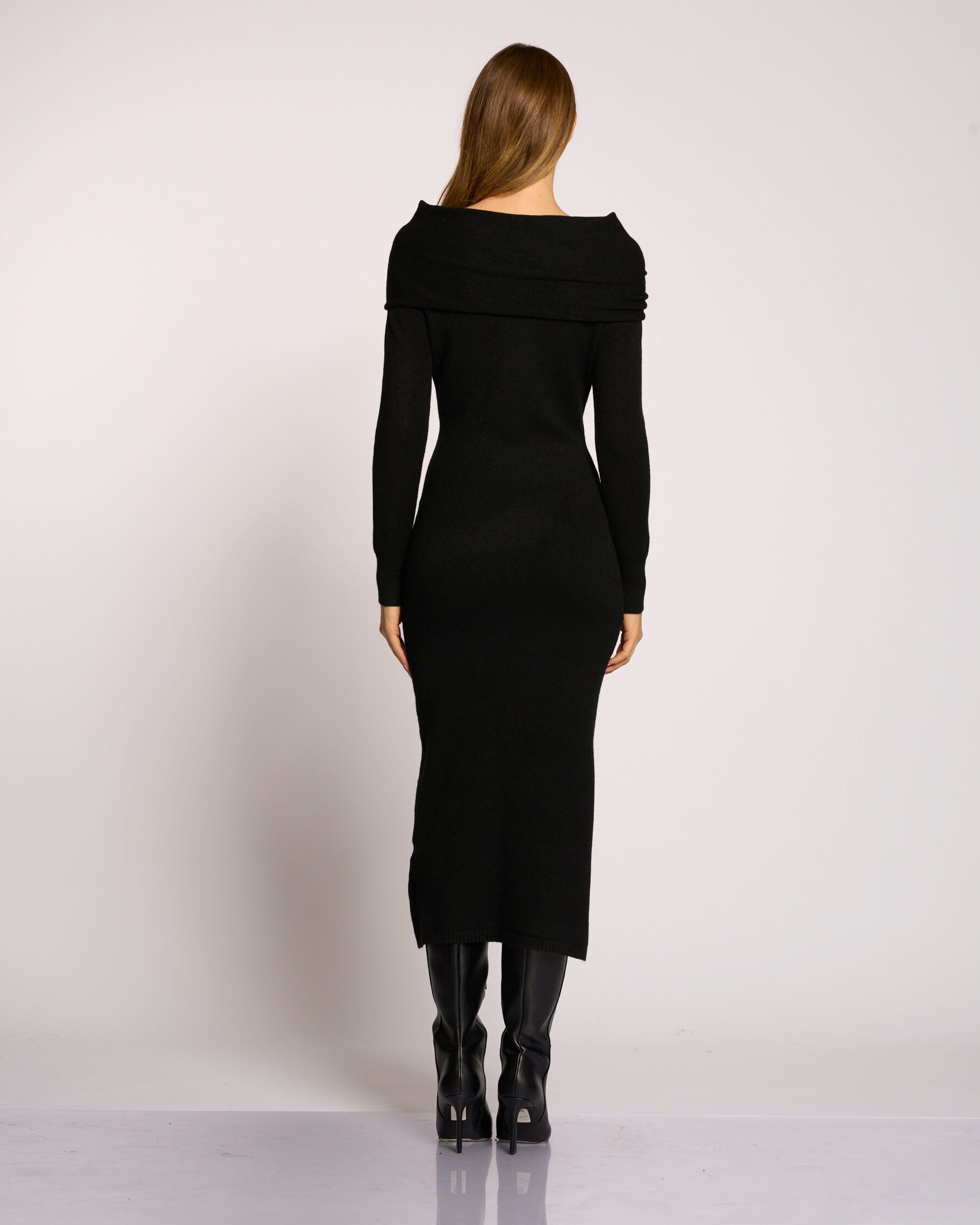 Abito in maglia lungo e sofisticato, pensato per esaltare la figura con eleganza e un tocco di modernità. Si distingue per il collo con risvolto, che incornicia il viso, e per il profondo spacco laterale, che aggiunge movimento alla lunghezza. Un capo versatile e d'impatto, ideale per combinare comfort e stile distintivo.