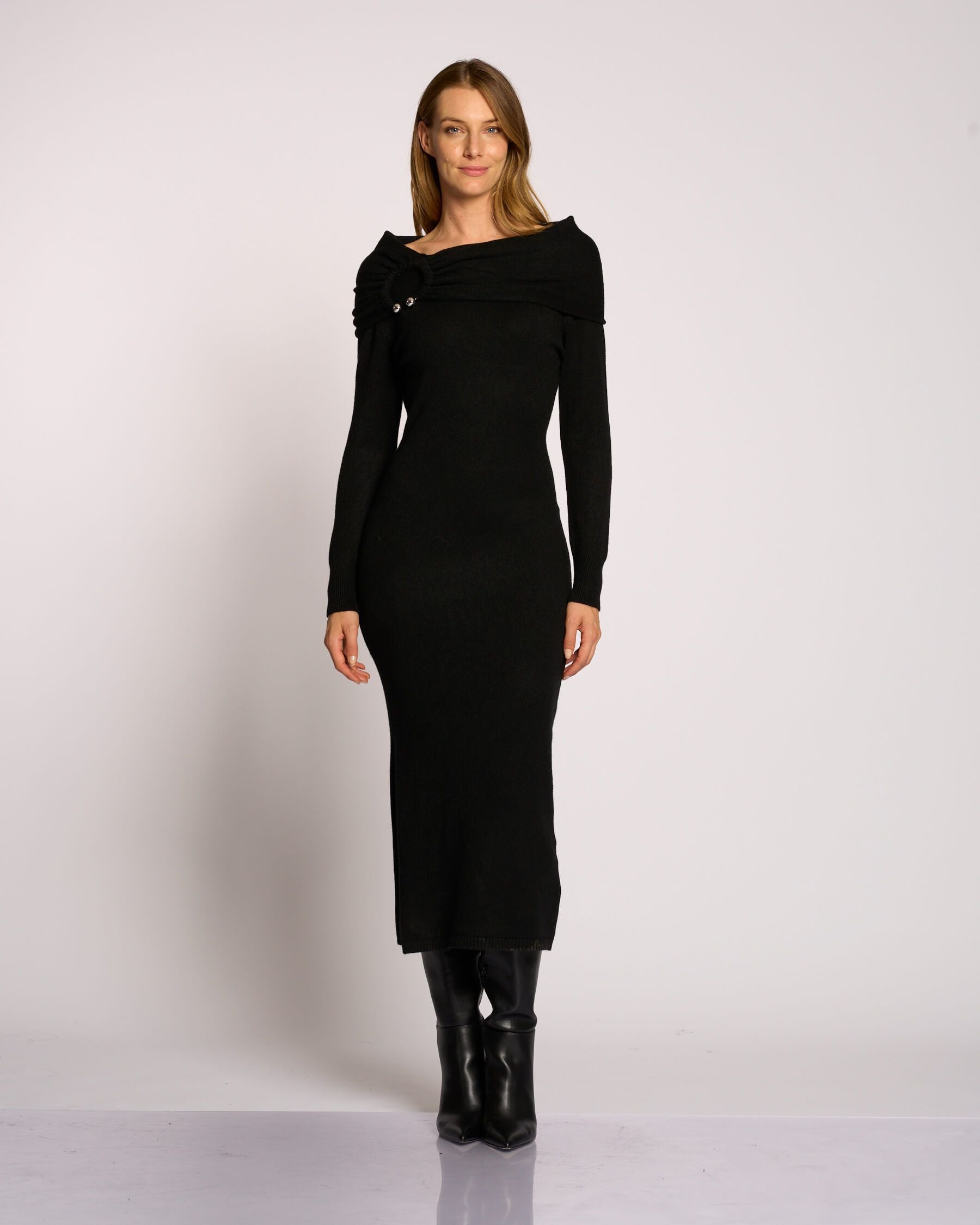 Vestito lungo in maglia con spacco laterale e anello sul collo rivoltato