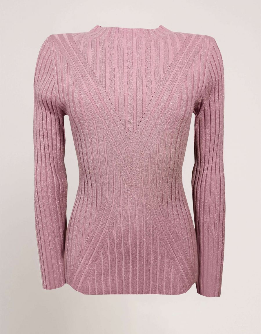 Un raffinato dolcevita che unisce comfort e brillantezza. Realizzato in lurex per un effetto scintillante, presenta una ricca texture a coste che si fonde con un elaborato motivo di trecce. È il capo perfetto per aggiungere un tocco di glamour e calore al tuo guardaroba invernale.
