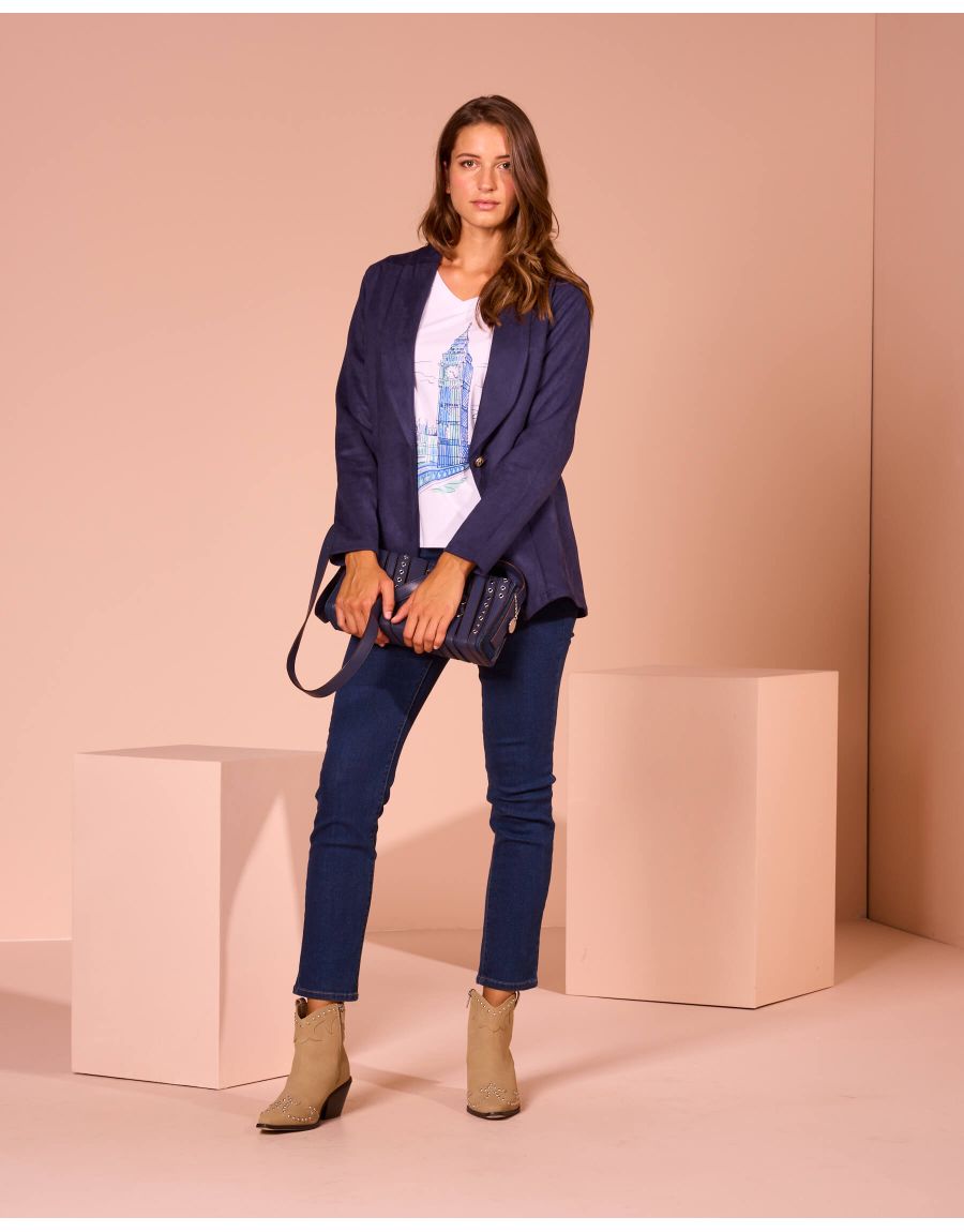 Questa giacca in ecosuede con scollo a scialle è la scelta ideale per un tocco di eleganza senza sforzo. Il tessuto morbido e l'eleganza del taglio la rendono un capo versatile, perfetto per completare un look formale o per aggiungere un tocco chic a un outfit casual.