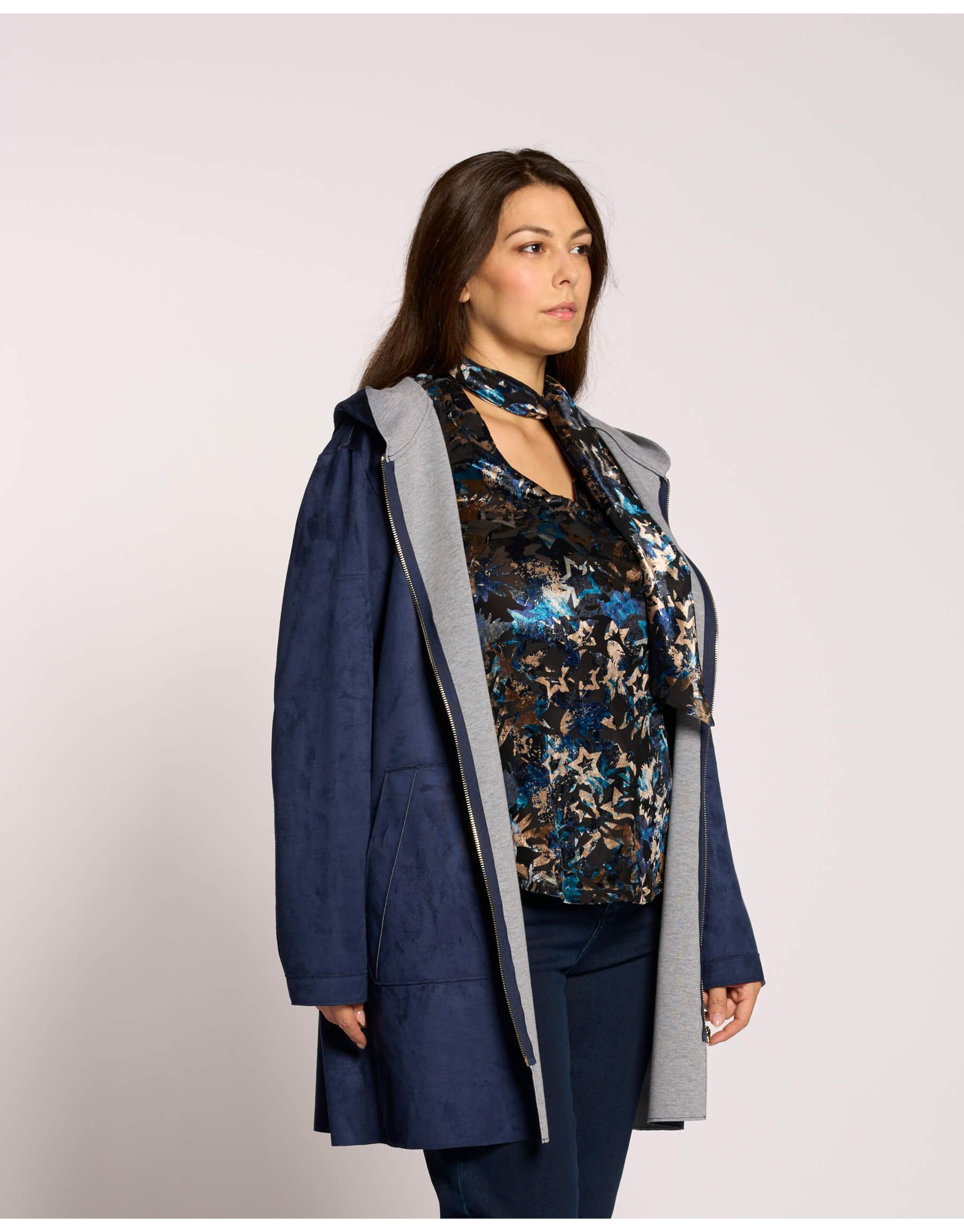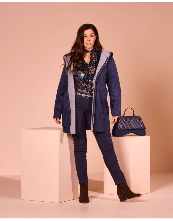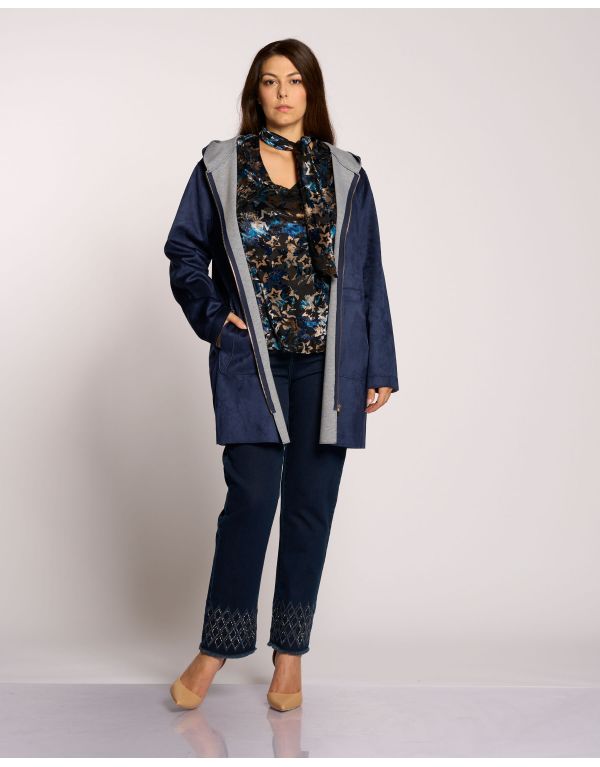 Spolverino in ecosuede doppiato in jersey con zip e cappuccio