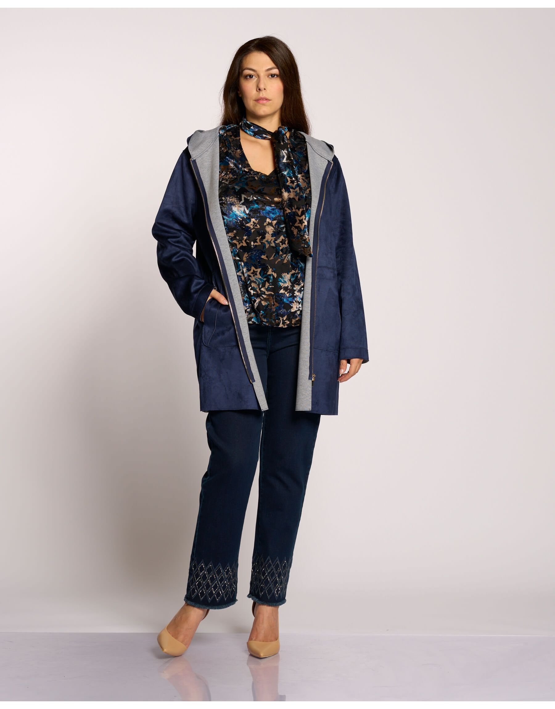 Perfetto per la mezza stagione, questo spolverino unisce stile e comfort. Realizzato in eco-suede, un tessuto morbido e sostenibile, è doppiato internamente in jersey, garantendo una vestibilità comoda e leggera. Il capo è rifinito con una pratica chiusura a zip e un cappuccio per una maggiore praticità.