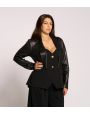Questa giacca in scuba crêpe unisce comfort e stile sartoriale, caratterizzata da un distintivo motivo di finto bolero realizzato in scuba pelle per un sofisticato contrasto materico e visivo.