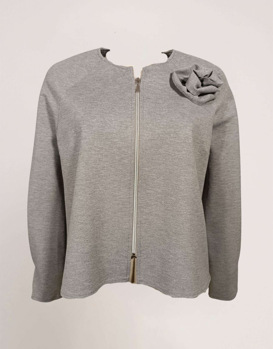 Questa giacca corta è un capo moderno e versatile, realizzata nel confortevole e strutturato punto Milano. Presenta una pratica chiusura con zip e un tocco distintivo dato dall'applicazione a fiore.