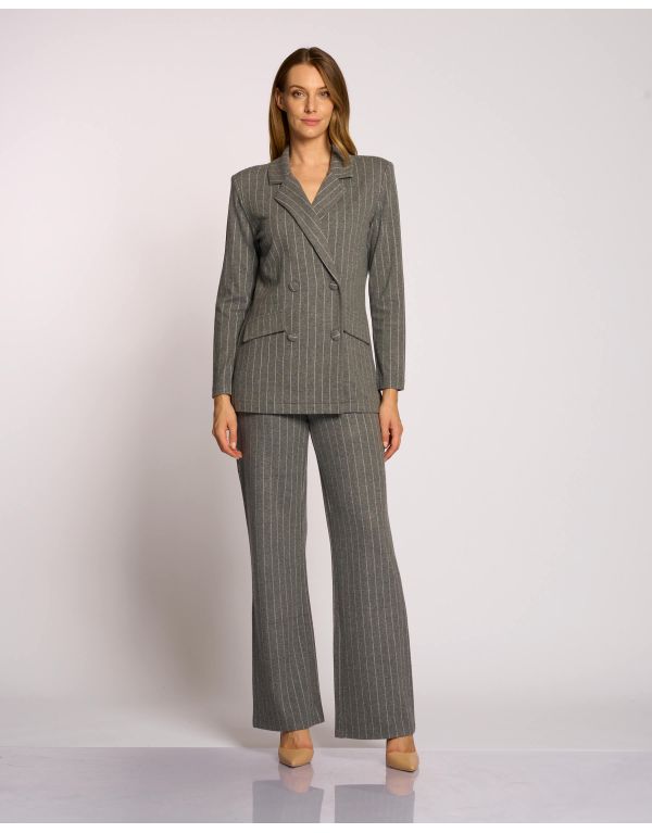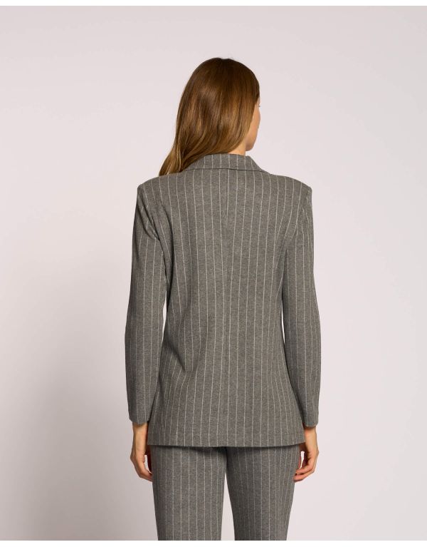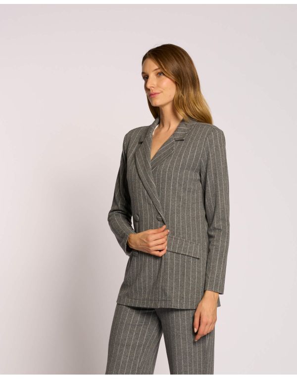 Giacca doppiopetto, realizzata in elegante tessuto gessato, che presenta revers classici e pratiche pattine. Perfetta per un look sofisticato e di tendenza.