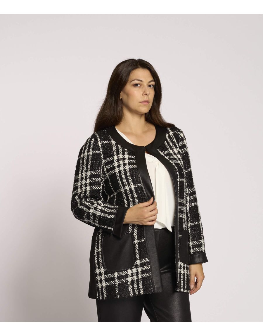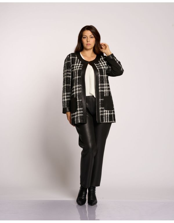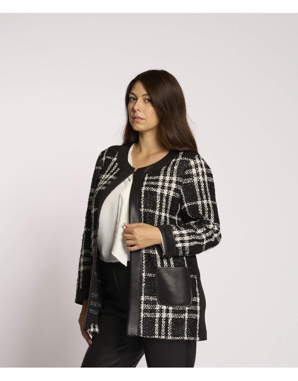 Giacca lunga in tessuto bouclé a quadri e lurex con riporti in scuba pelle