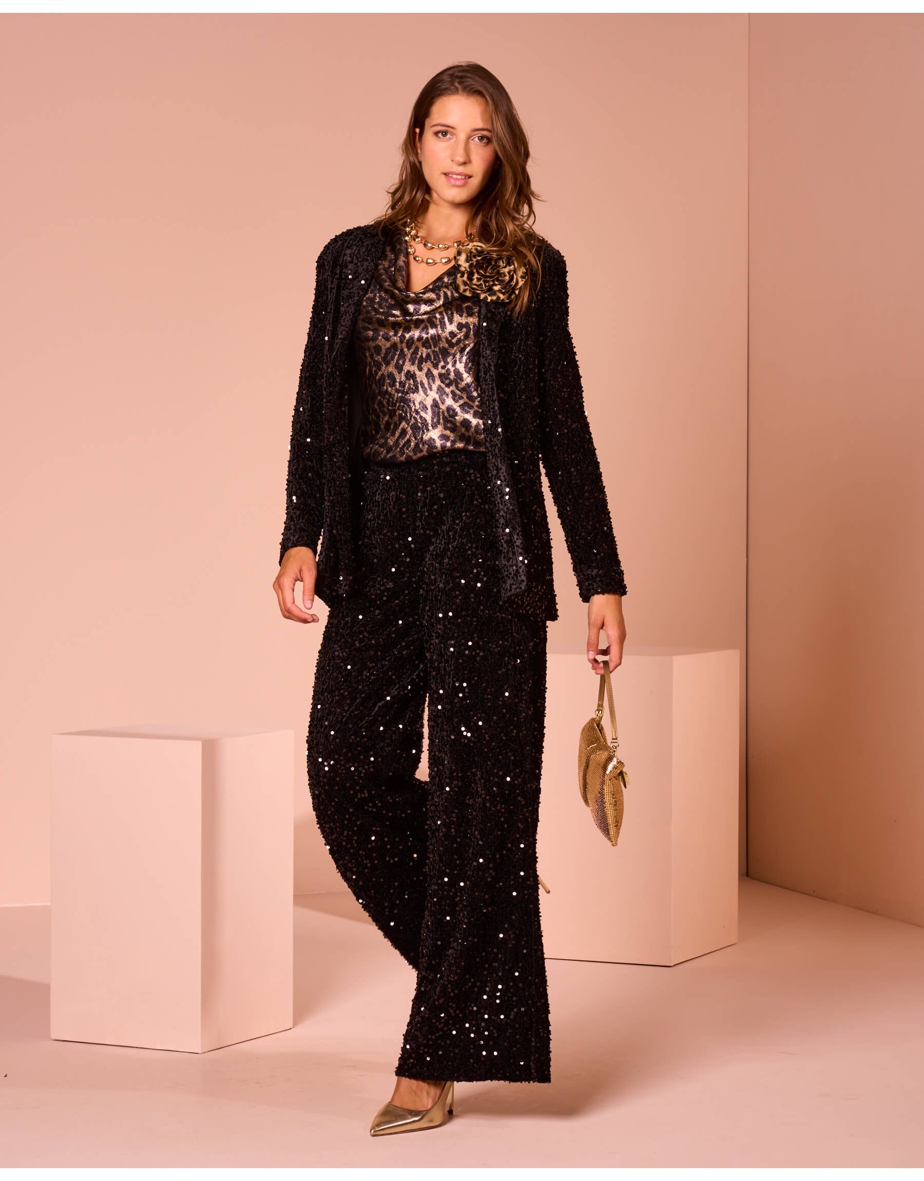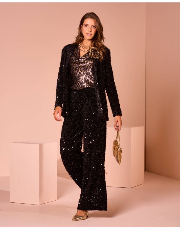 Giacca con revers classici e chiusura a due bottoni, interamente rivestita da una ricca ciniglia ricamata con paillettes per un effetto luminoso e materico. La fodera interna assicura un comfort ottimale, rendendola un capo sofisticato e d'impatto per le occasioni speciali.