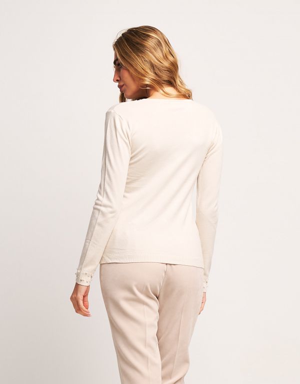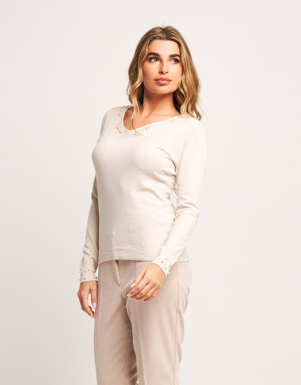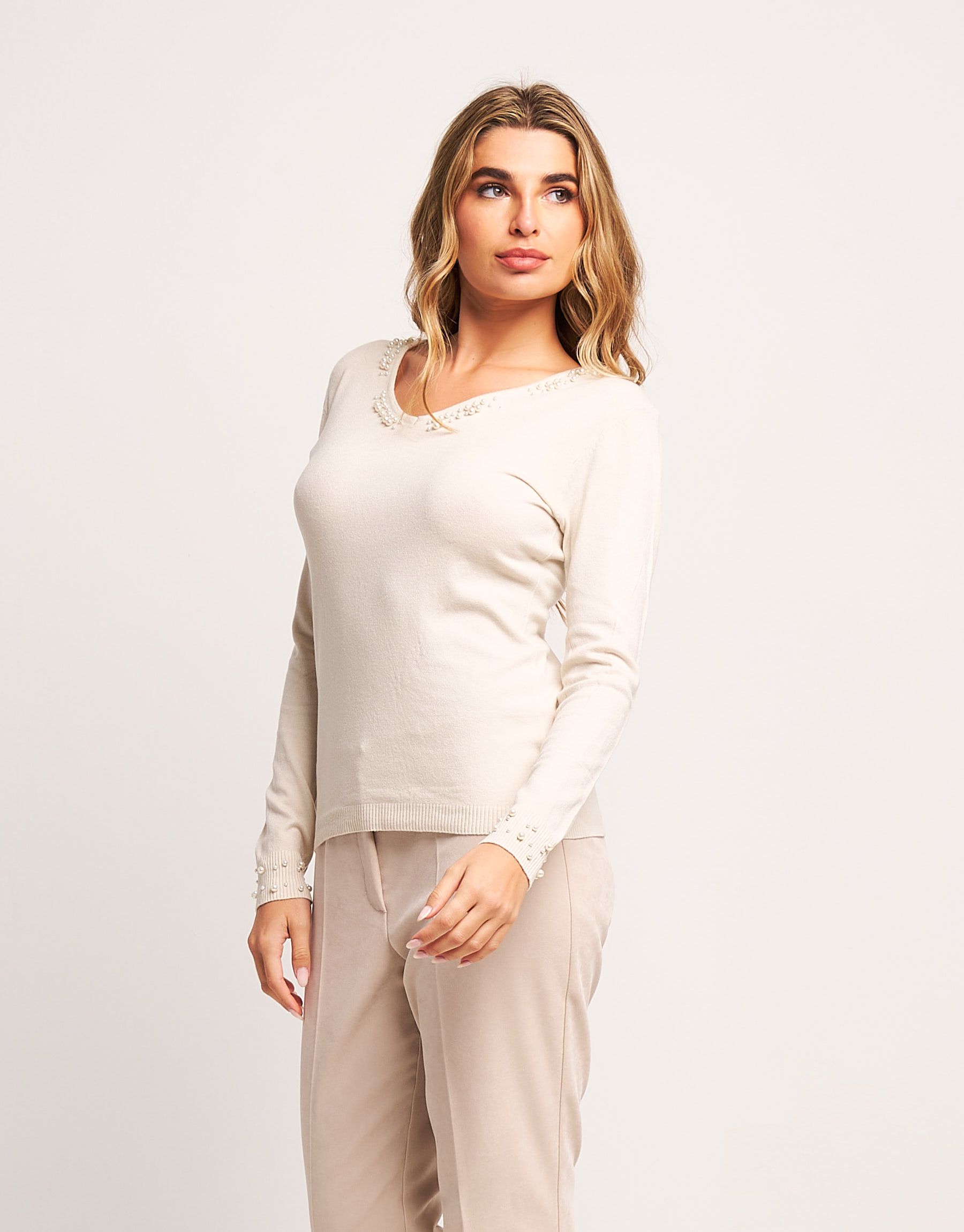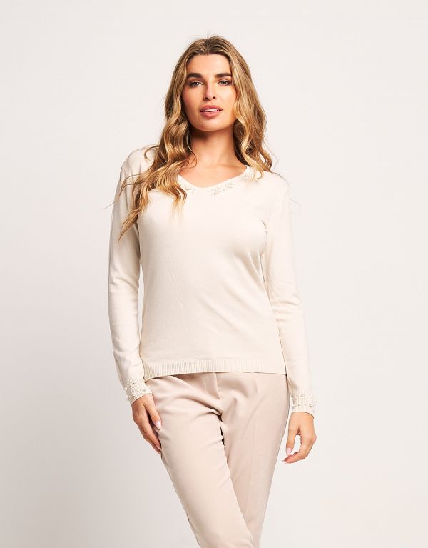 Maglia con dettagli di perle sullo scollo a V e ai polsi