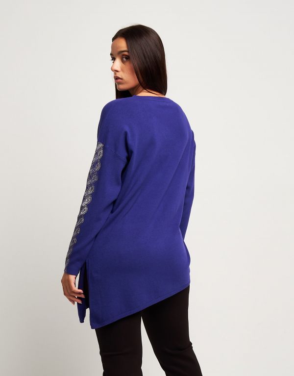 Maglia lunga con punta laterale e motivo di strass sulle maniche