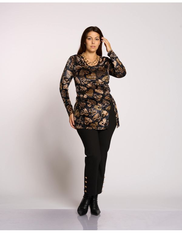 Maglia lunga in ciniglia dévoré con collo a cappuccio e spacco