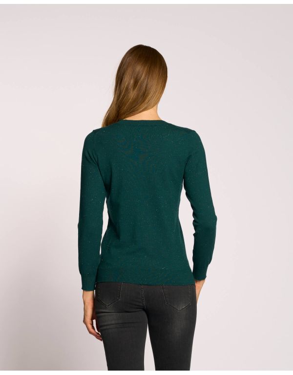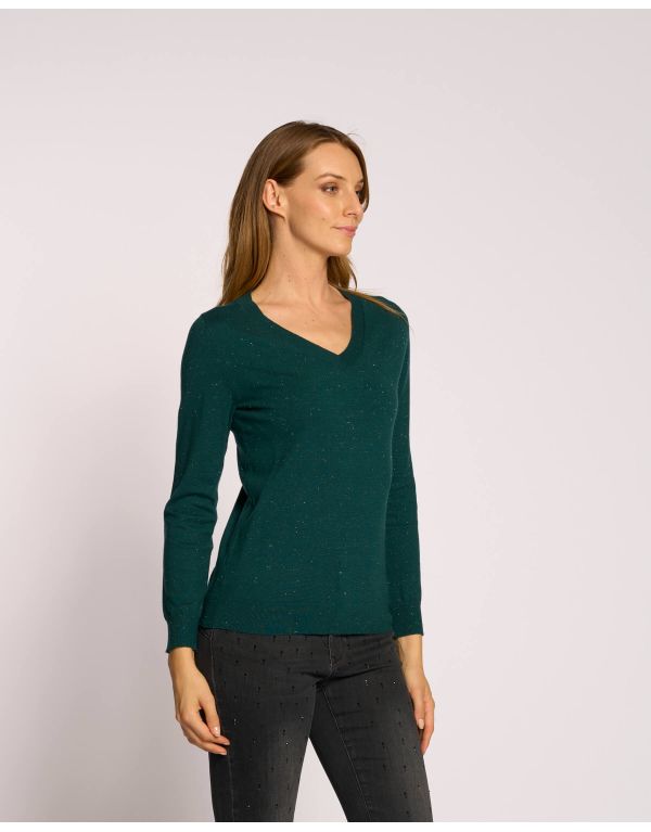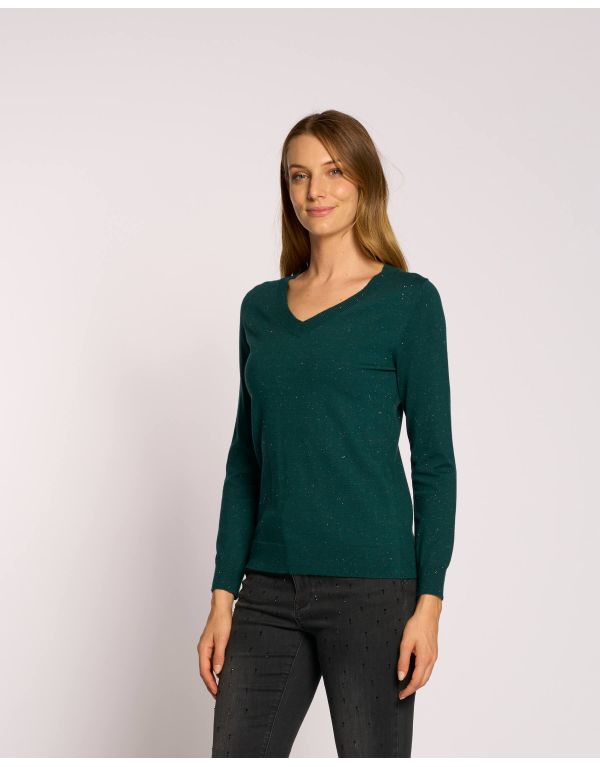 Maglia a maniche lunghe basic con scollo a V, realizzata in morbido filato con dettagli in lurex per un tocco scintillante. Un capo versatile e confortevole, perfetto da indossare da solo o come sottogiacca per un look che unisce eleganza e praticità.