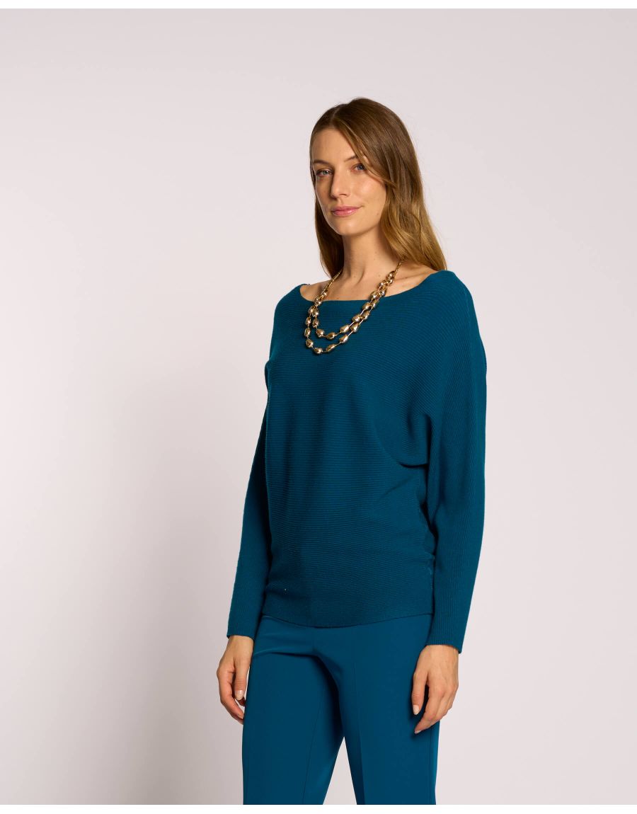 Una maglia basica a coste in filato morbido, con scollo a V e maniche a pipistrello. Il suo design ampio e confortevole la rende perfetta per ogni occasione. Questo capo versatile ti offre un look casual ed elegante, ideale per un tocco di stile in più nel tuo guardaroba.