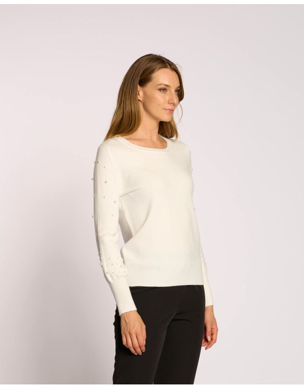 Maglia dalla linea pulita, arricchita da un tocco di eleganza grazie alle perle applicate in modo delicato sulle maniche, che le conferiscono un look raffinato e versatile. Perfetta per ogni occasione.
