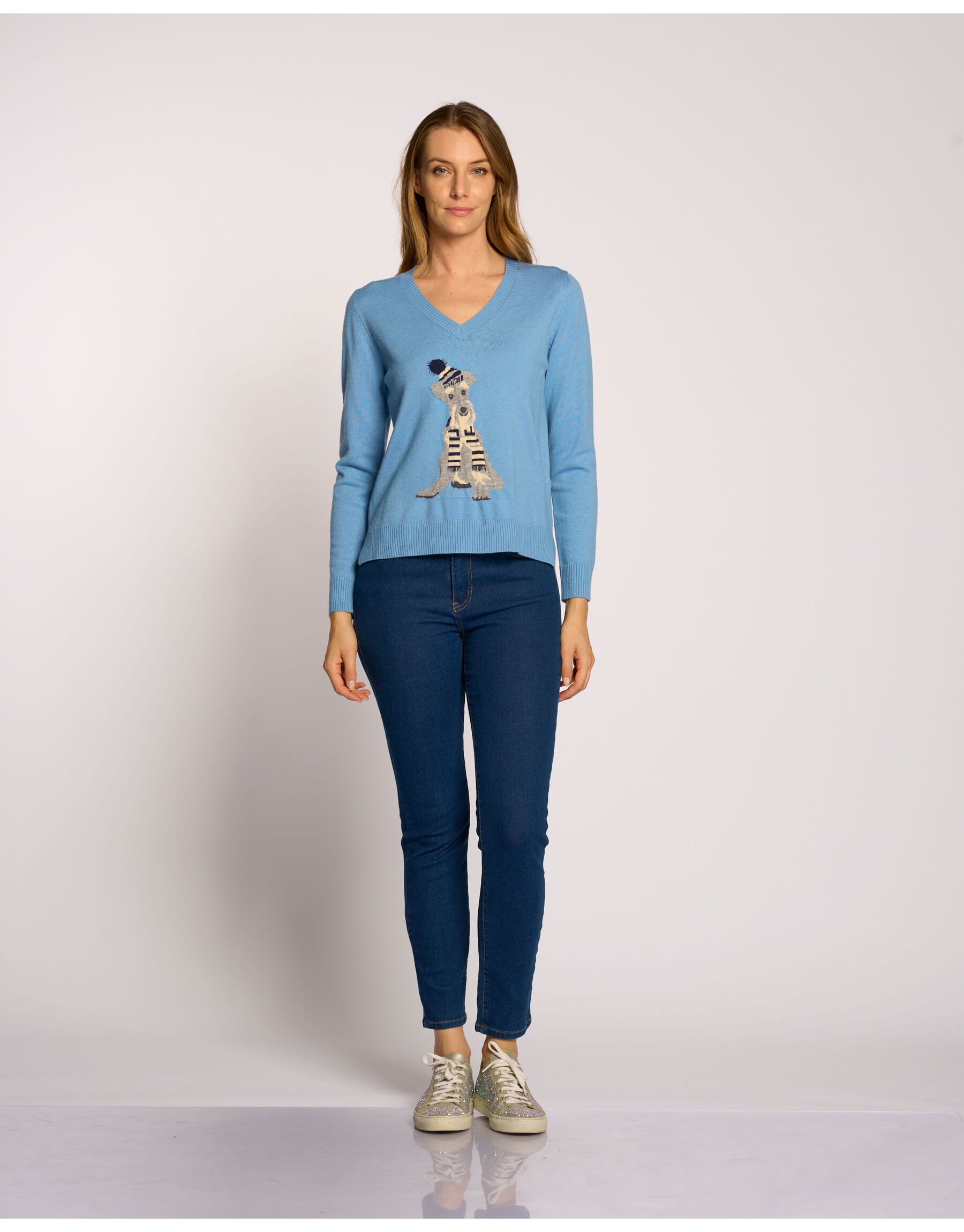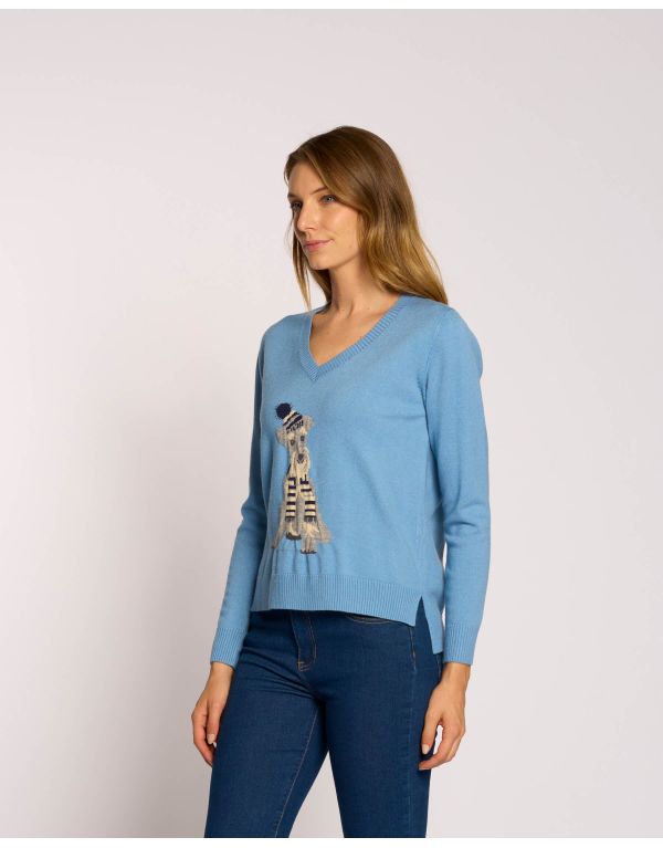 Maglia scollo a V con intarsio cagnolino