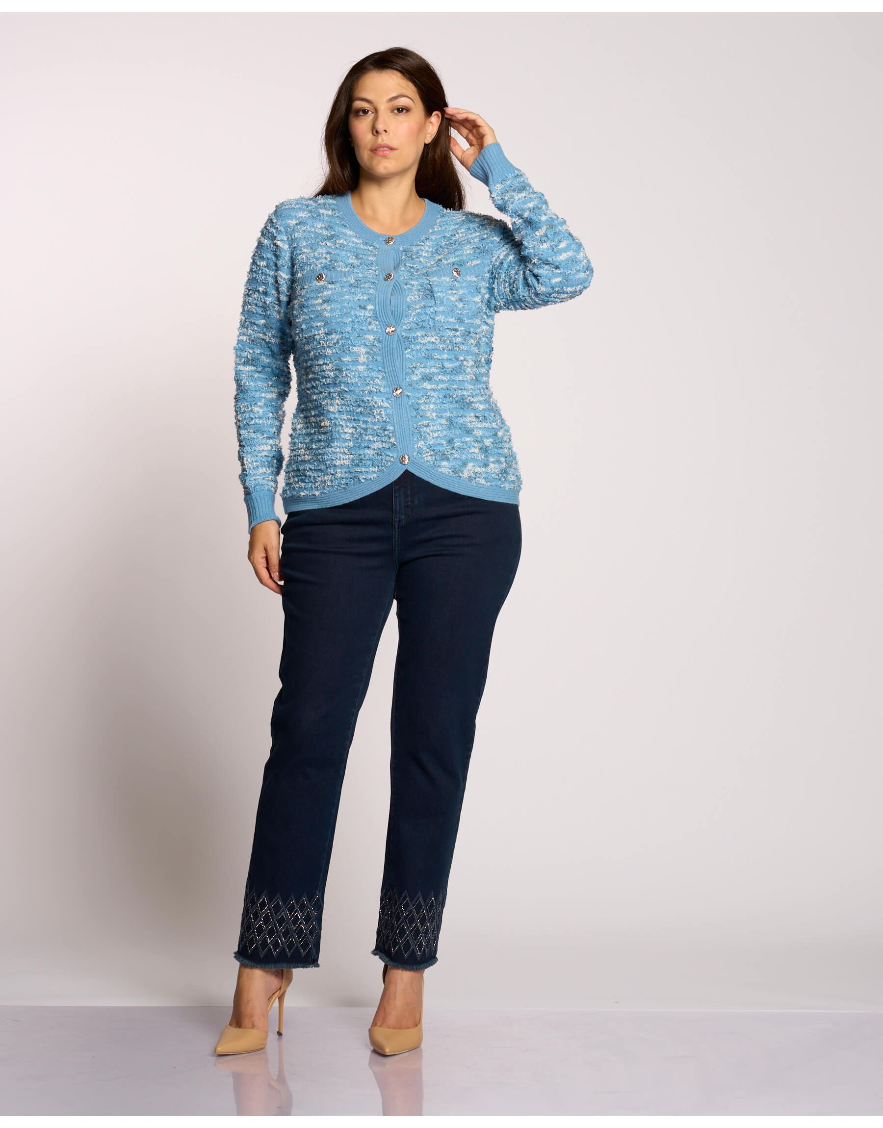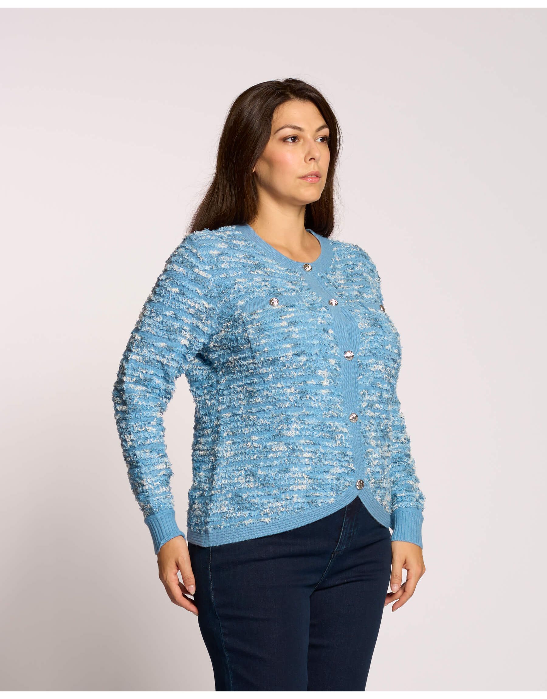 Questo golfino unisce un comfort morbido a dettagli di tendenza. L'effetto bouclé gli conferisce una texture ricca e voluminosa. È arricchito da eleganti pattine decorative e bottoni color argento che aggiungono un tocco moderno e lucente. È un capo versatile e sofisticato, perfetto per vestire ogni look con calore e stile.