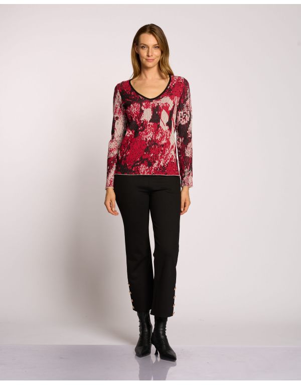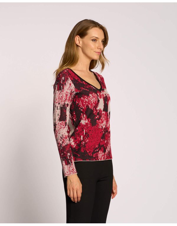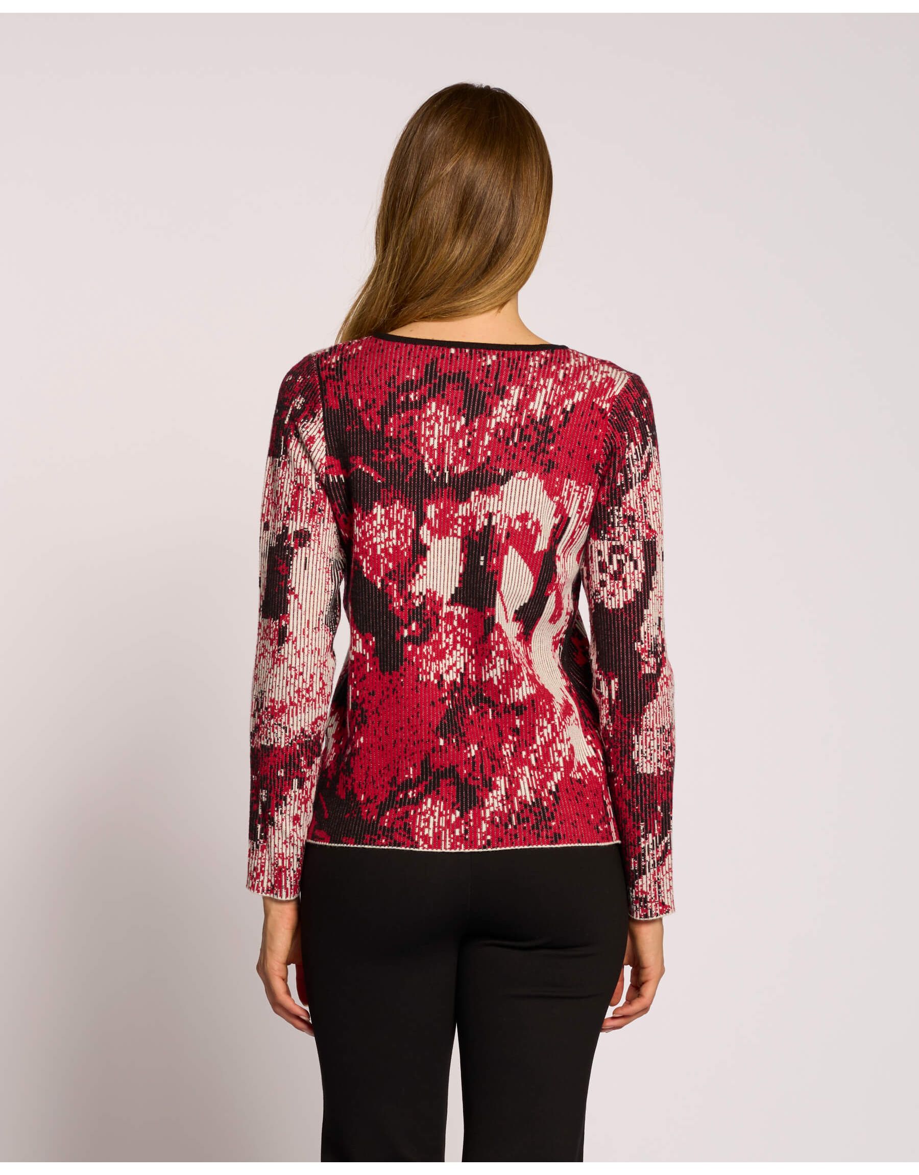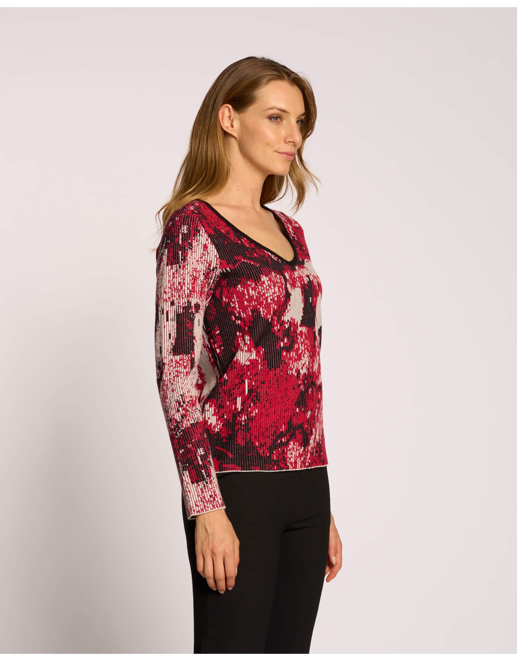 Questa maglia jacquard a coste offre una texture ricca e visivamente interessante. Lo scollo a V slancia la figura, rendendola un capo elegante e versatile, perfetto per aggiungere un tocco di stile al guardaroba.