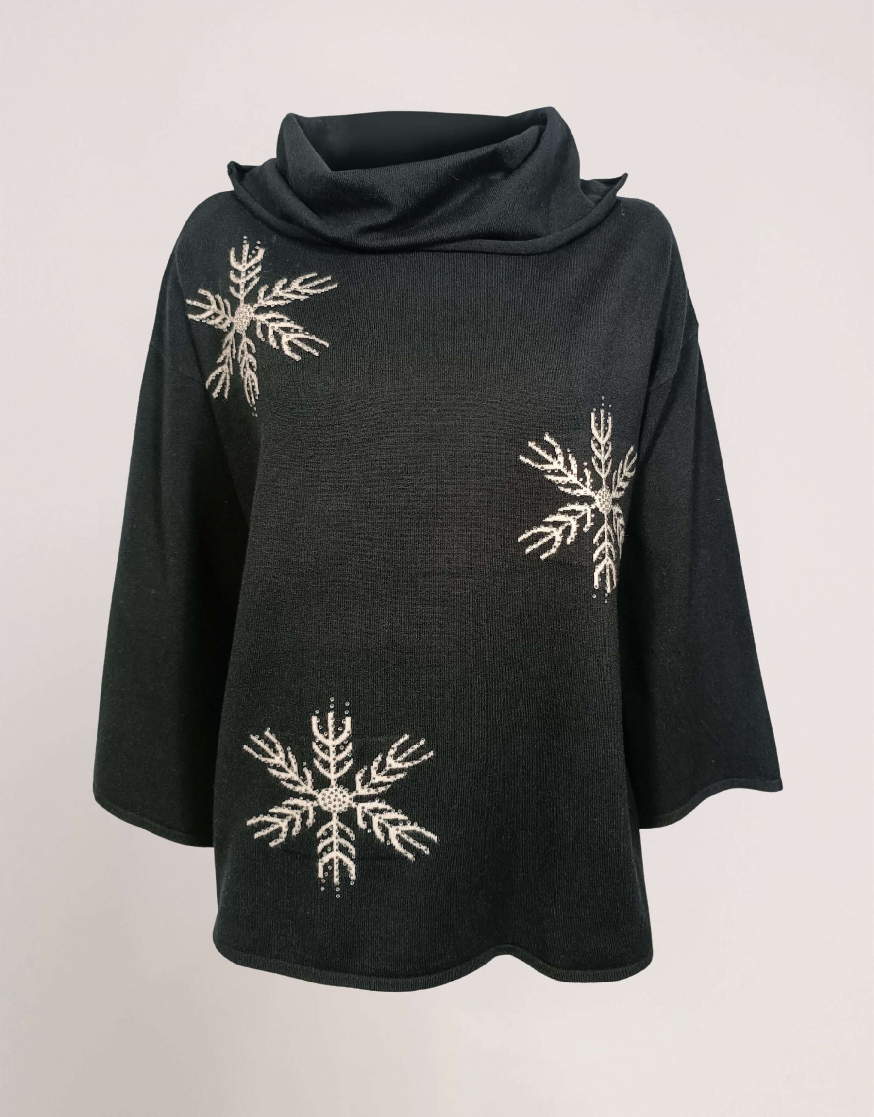 Questa ponchetta avvolgente e chic è caratterizzata da un delicato intarsio a fiocchi di neve, che le conferisce un fascino invernale e raffinato. I dettagli in strass aggiungono un tocco di luce e brillantezza, rendendola un accessorio perfetto per le occasioni speciali o per elevare il tuo look quotidiano.