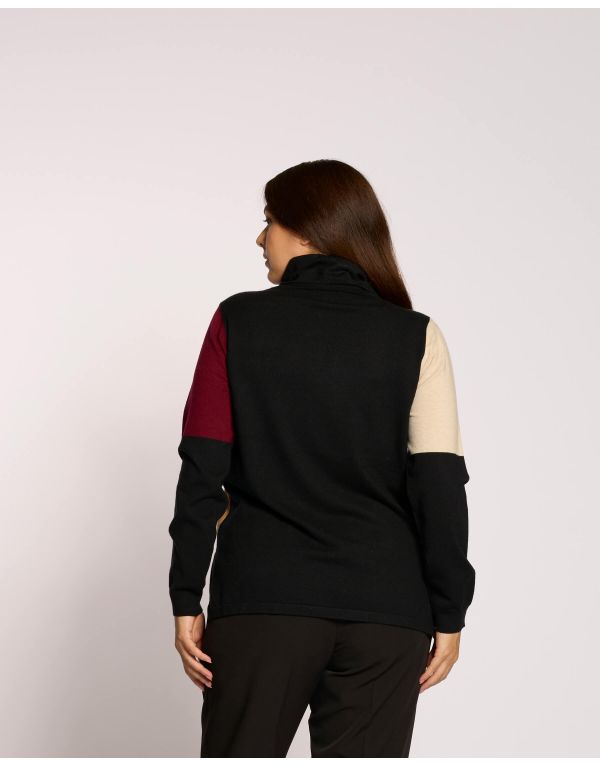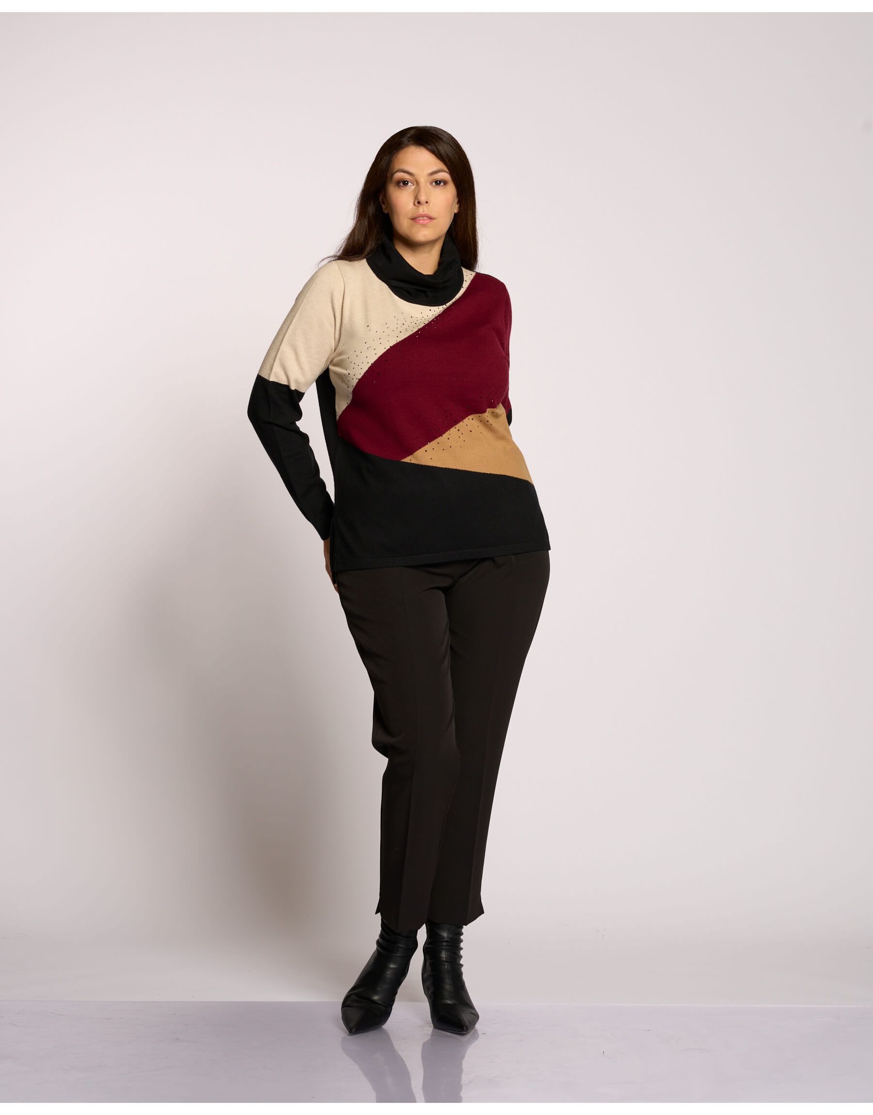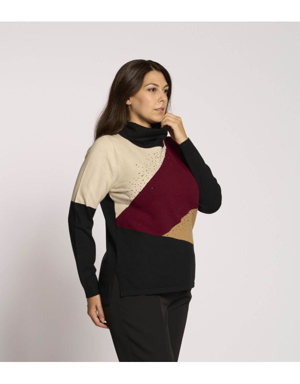 Questa maglia color block è un capo d'impatto che unisce comfort e brillantezza. Il design presenta un moderno accostamento di colori e un avvolgente collo alto. Il tocco glamour è dato dagli strass neri che impreziosiscono il capo, aggiungendo una nota luminosa e sofisticata. Perfetta per elevare un look invernale.