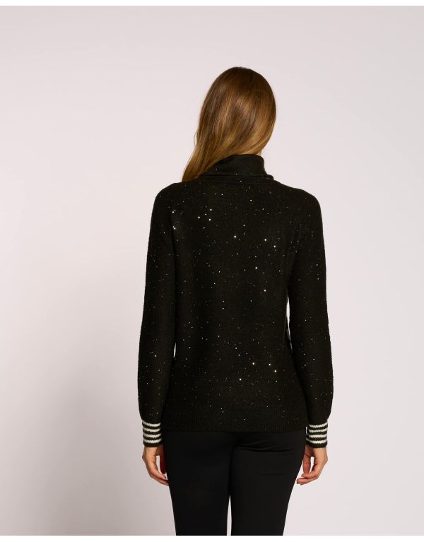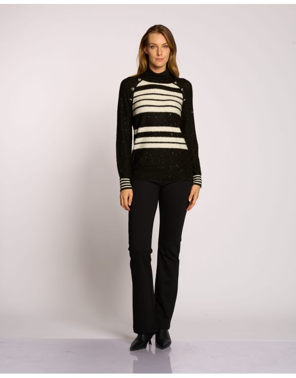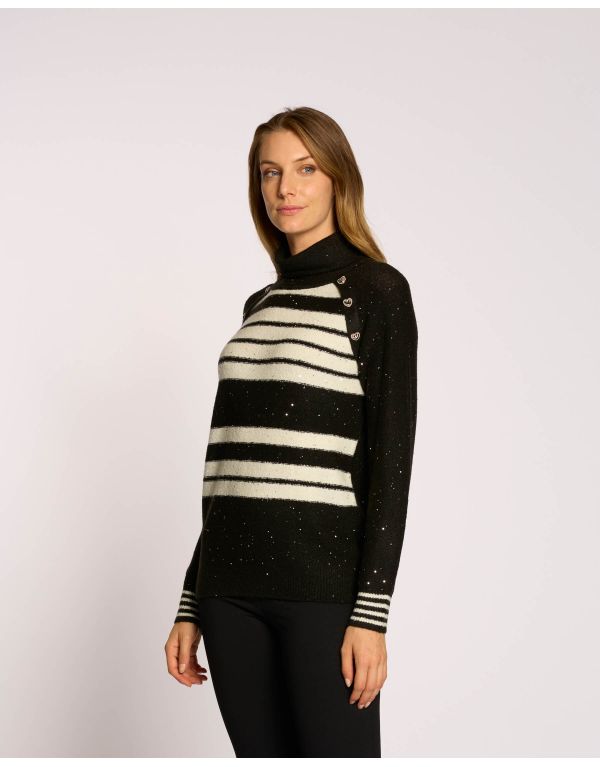 Una maglia dal design distintivo, realizzata in un filato a righe arricchito da paillettes per un effetto scintillante. Presenta un caldo collo alto e la particolarità dei bottoni posizionati lungo il giro manica raglan, che aggiungono un dettaglio ricercato.