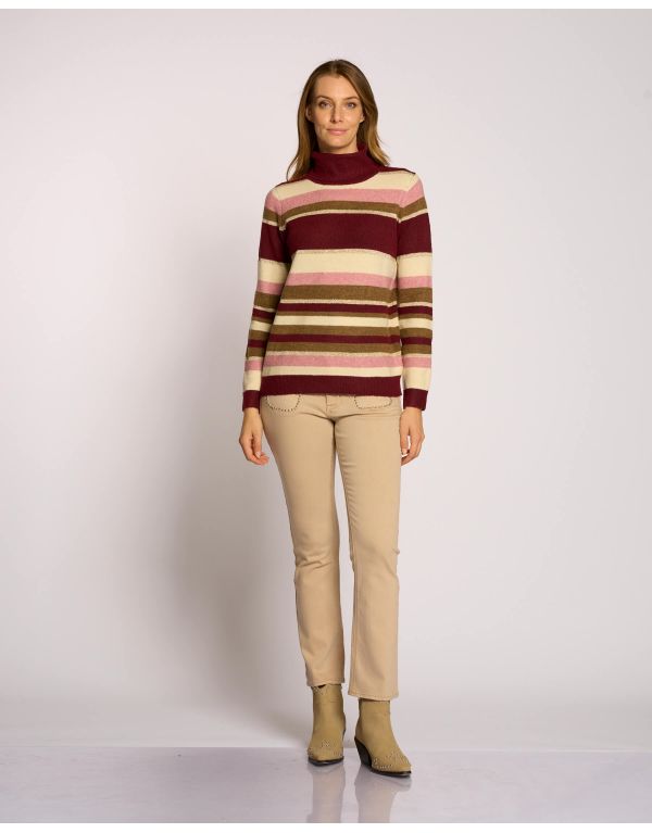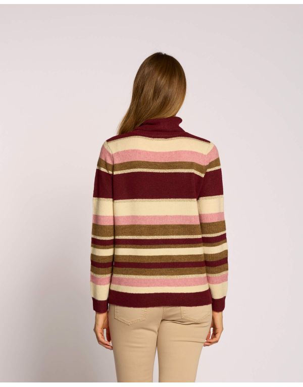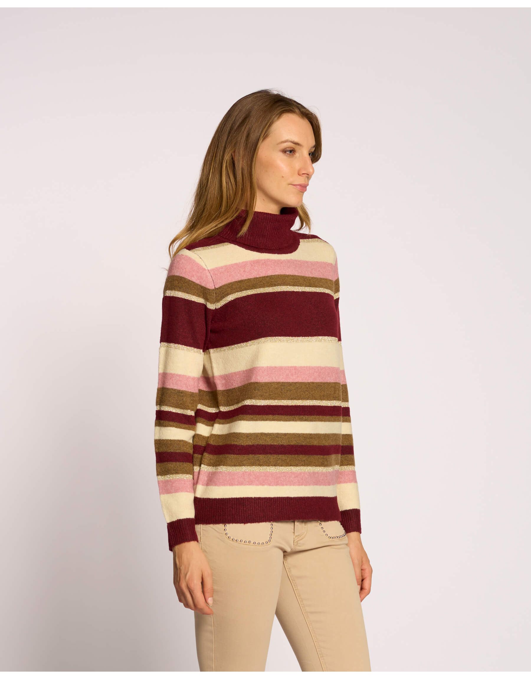 Questa maglia a collo alto è caratterizzata da un raffinato motivo a righe miste. Il filato è impreziosito dall'inserimento di lurex, che aggiunge un discreto scintillio e luminosità, rendendo il capo elegante e caldo..
