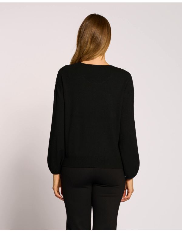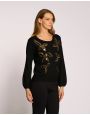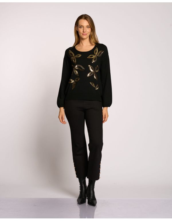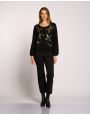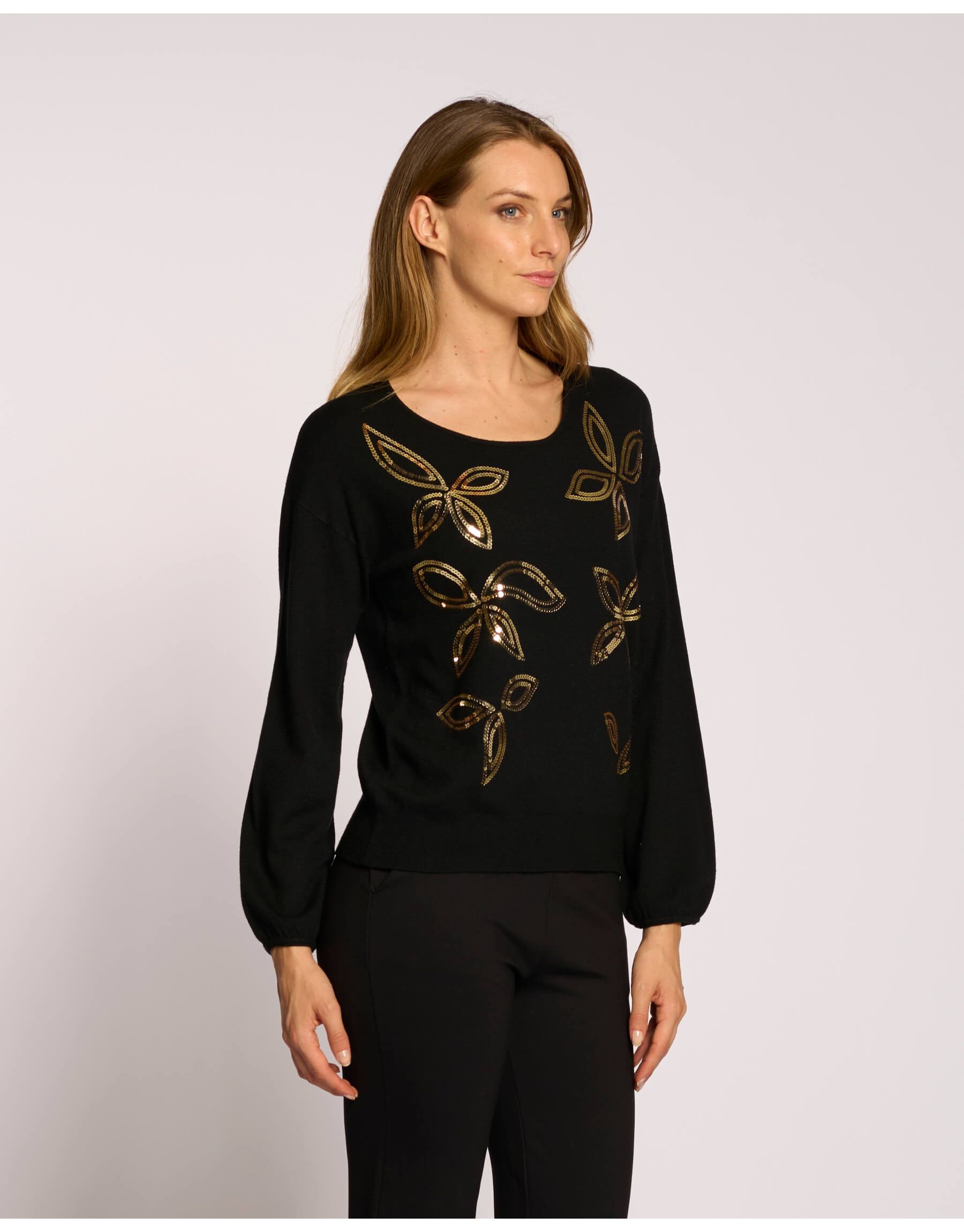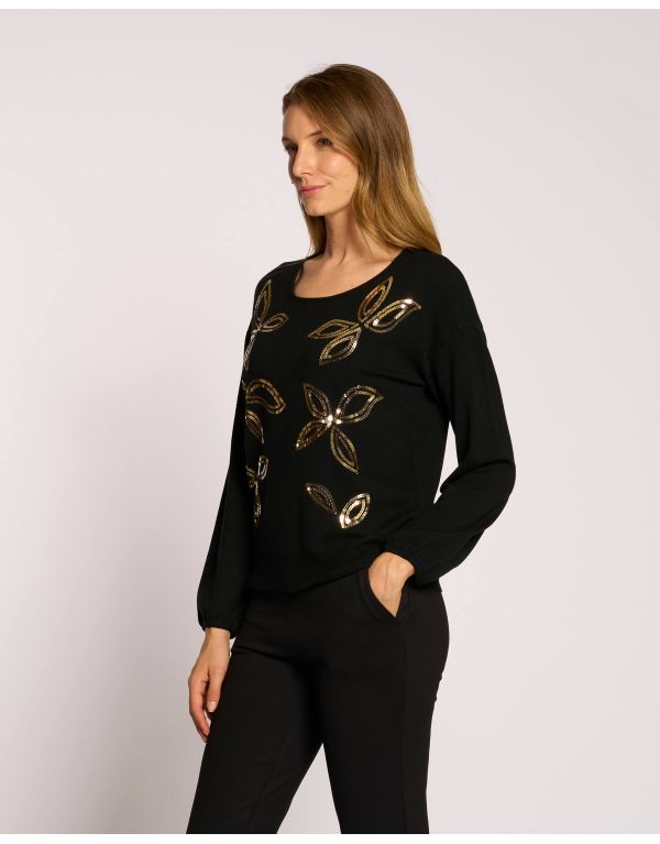 Una raffinata maglia dal tocco femminile e scintillante, impreziosita da un delicato ricamo floreale di paillettes che cattura la luce ad ogni movimento, perfetta per aggiungere un tocco di eleganza e vivacità al tuo look.