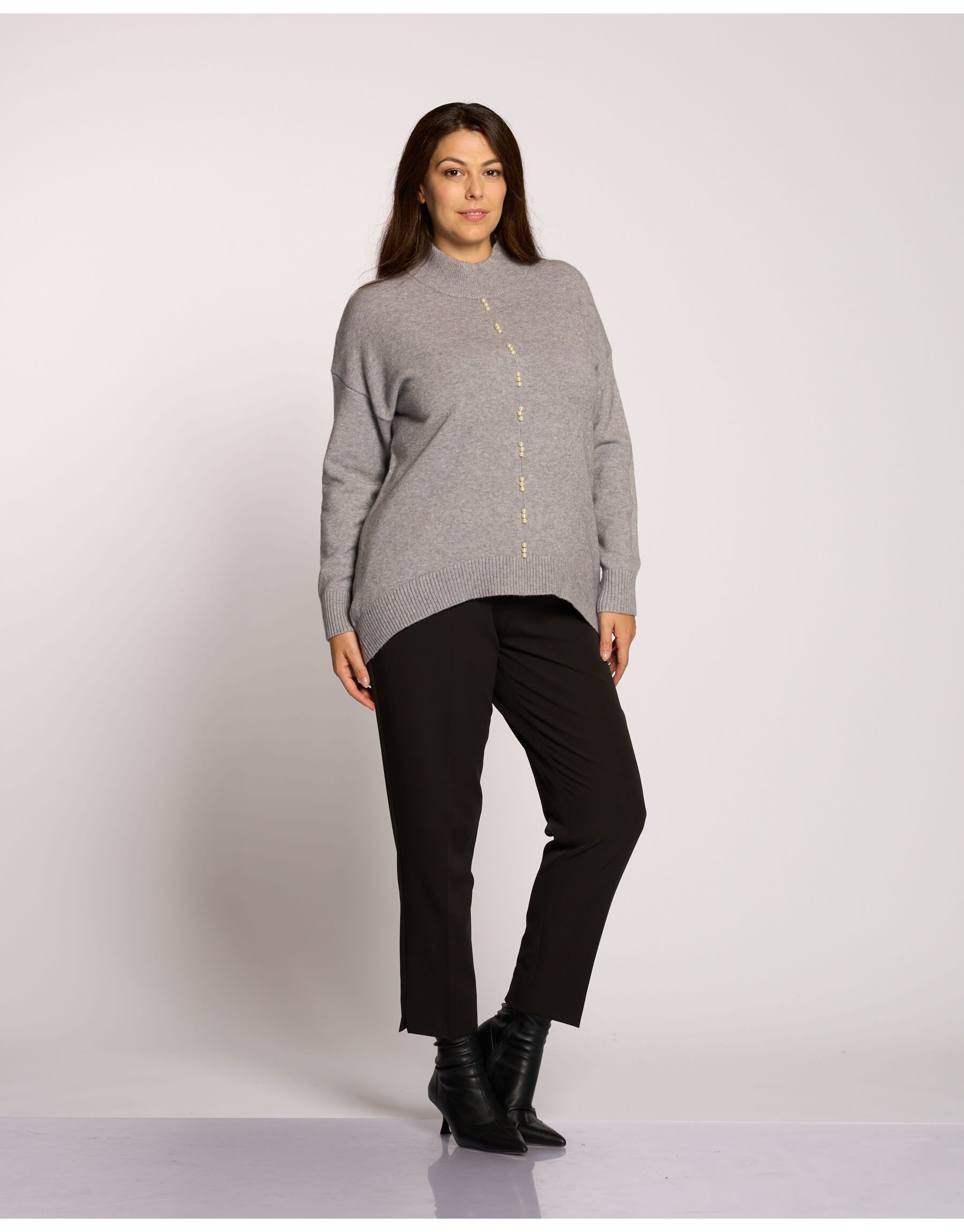 Una classica e versatile maglia a collo alto, rivisitata con un fondo leggermente stondato che valorizza la silhouette, e arricchita da una riga orizzontale di perle che aggiunge un dettaglio chic al capo.
