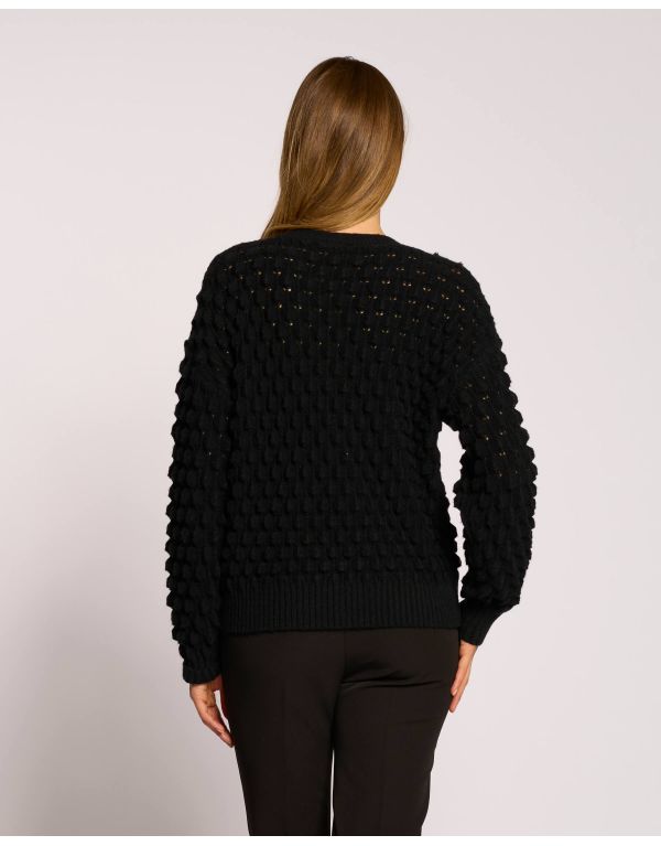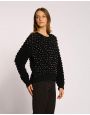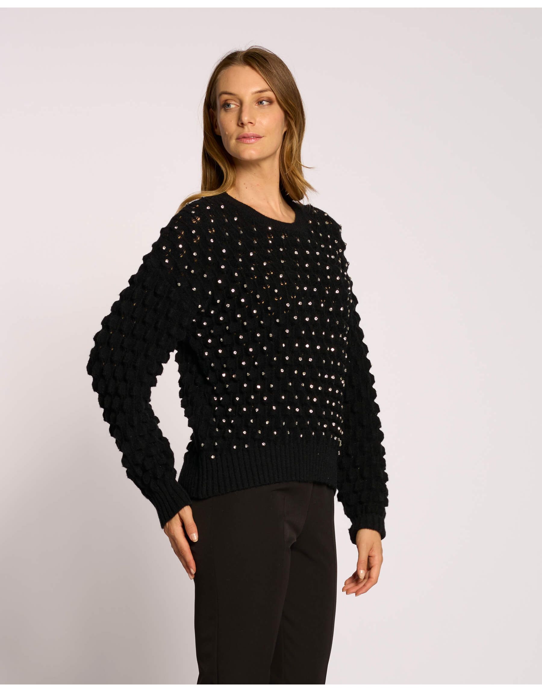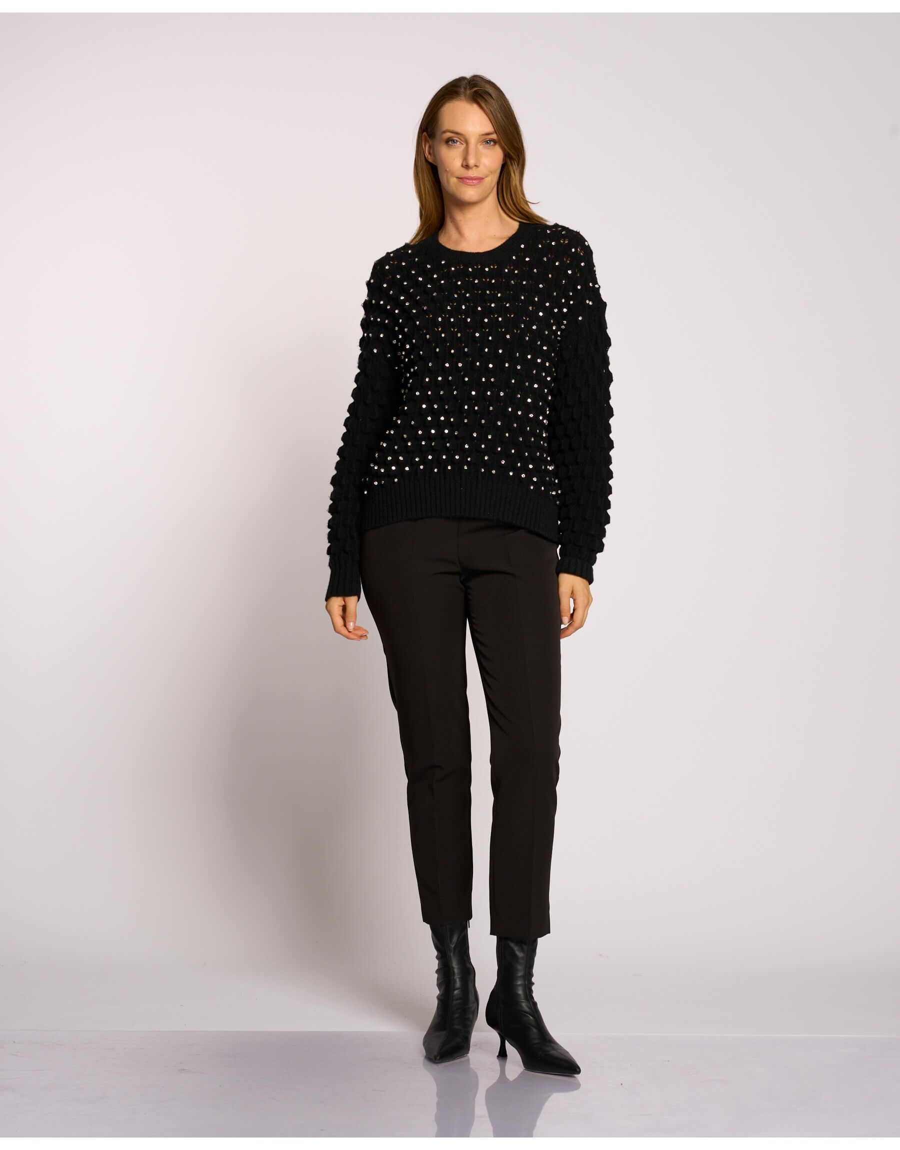Questa maglia si distingue per l'originale lavorazione a squame, che crea un effetto tridimensionale e una texture visivamente affascinante. Il capo è arricchito da scintillanti diamanti che trasformano questa maglia in un vero e proprio gioiello da indossare, perfetto per look serali di grande impatto.