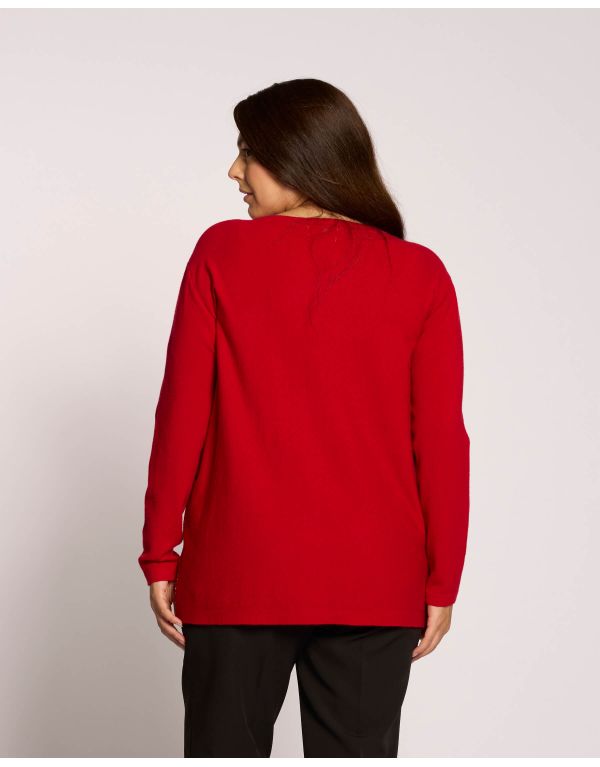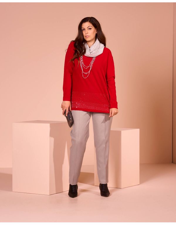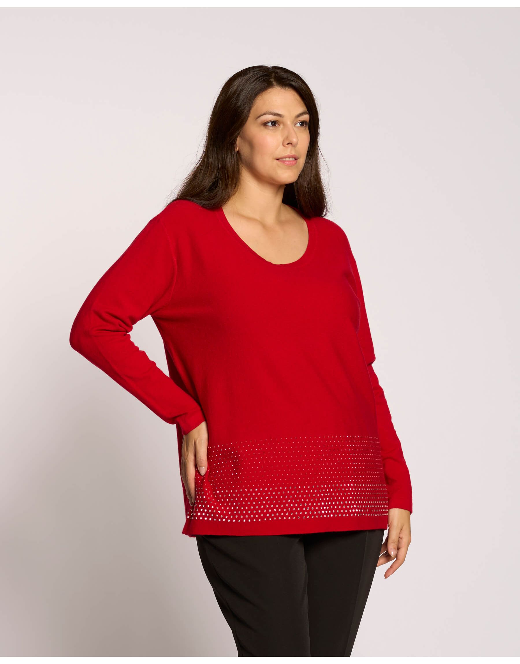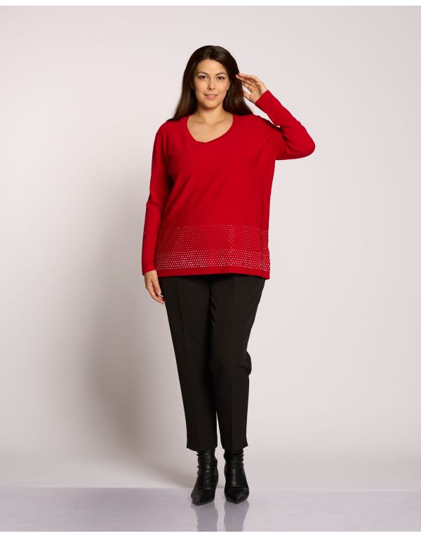 Questa maglia combina la morbidezza del tessuto con un tocco di luce inaspettato. Il bordo inferiore è impreziosito da una linea di strass scintillanti, che aggiunge un dettaglio glamour e sofisticato. Perfetta per elevare un look quotidiano o per brillare nelle serate speciali.