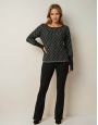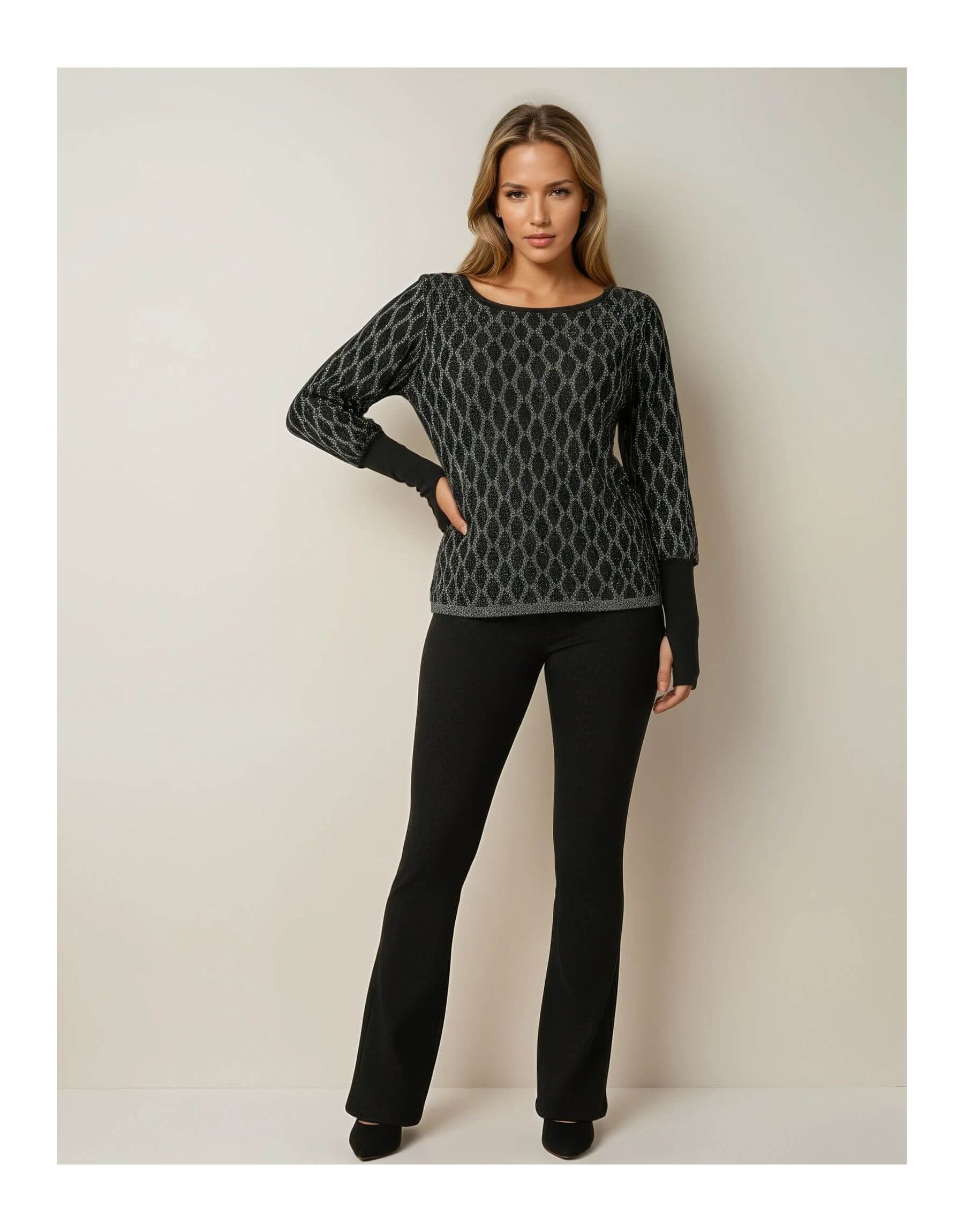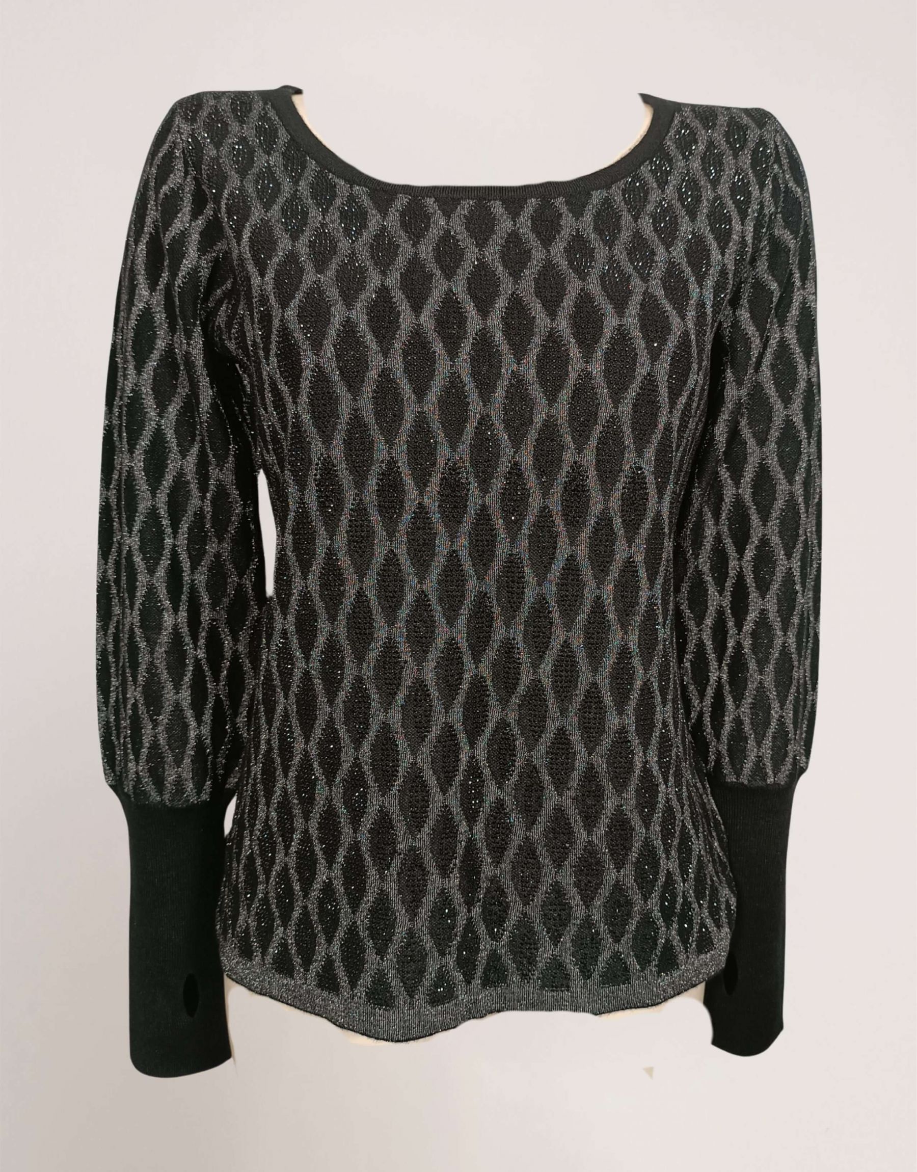 Maglia con disegno di lurex, strass neri e polsi alti a coste
