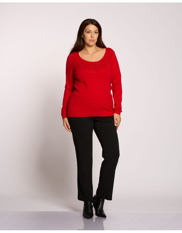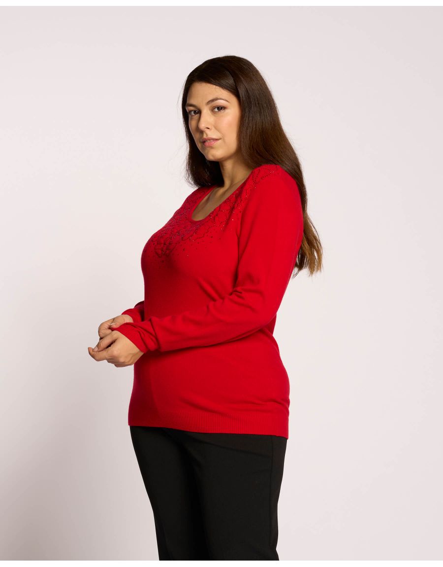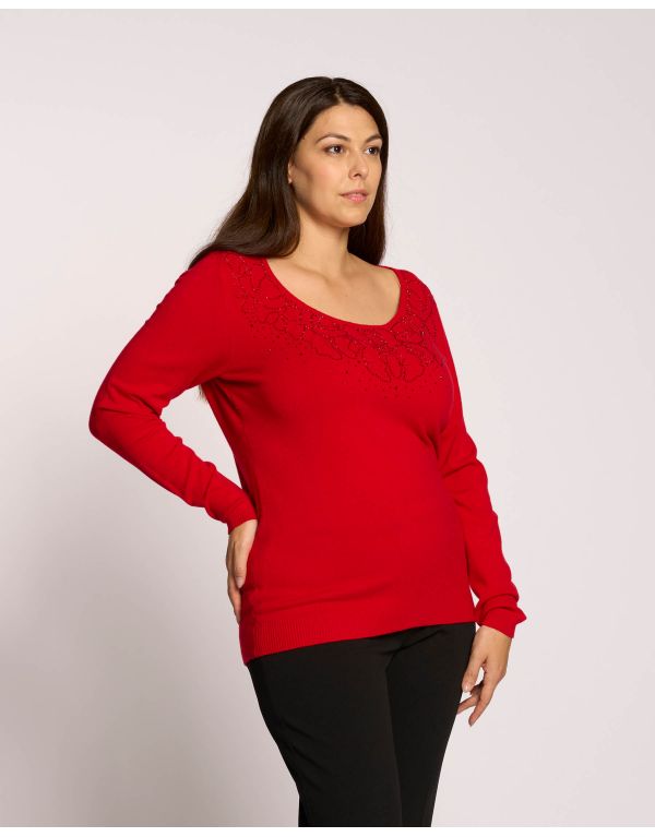 Maglia sofisticata impreziosita da delicati fiori in faille applicati sullo scollo, valorizzati da strass luminosi in tono che ne esaltano la tridimensionalità. Un capo che aggiunge un tocco romantico e ricercato a qualsiasi look.