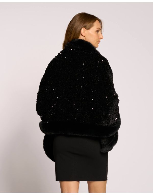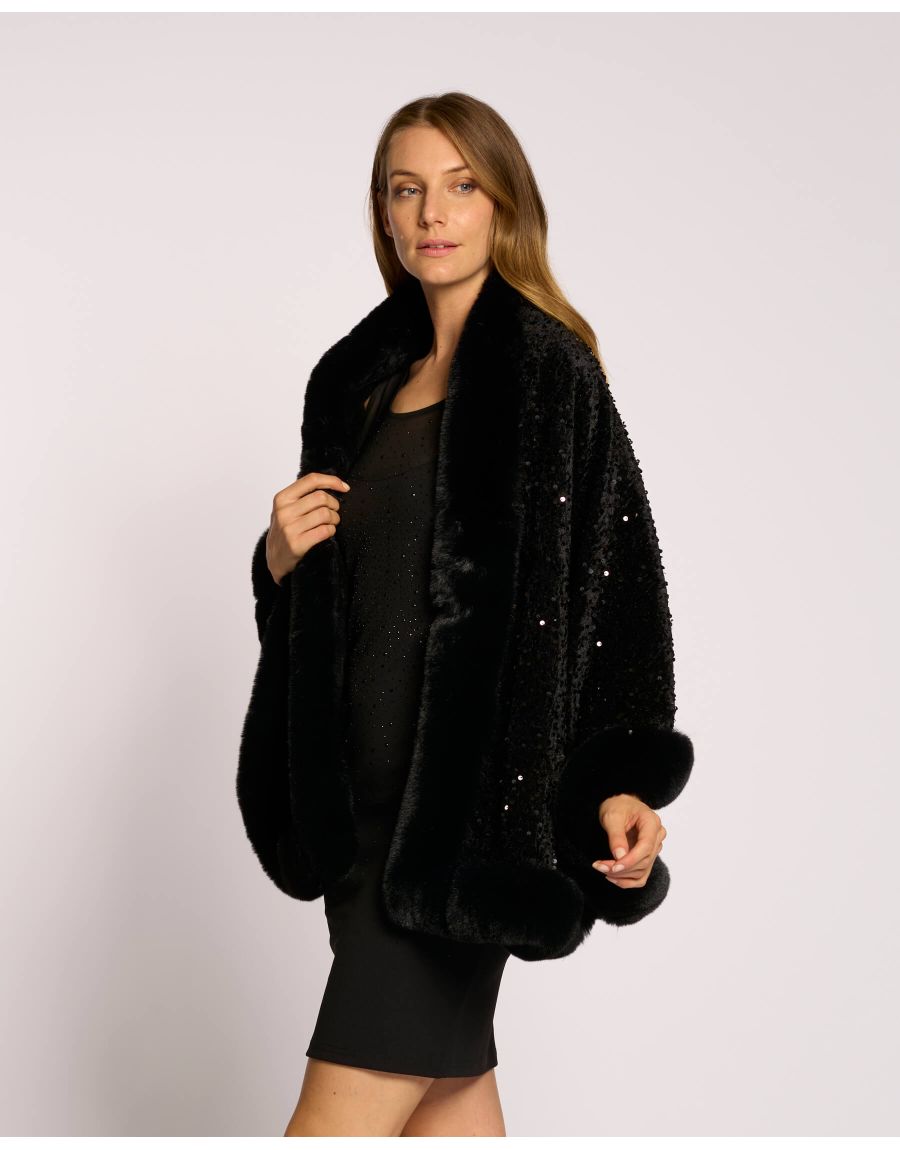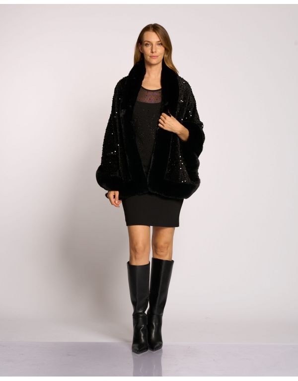 Avvolgente mantella in morbida ciniglia, arricchita da un'elegante lavorazione ricamata con paillettes che aggiungono un tocco scintillante. I bordi in ecopelliccia completano il capo, offrendo una sensazione di lusso e calore per un look invernale sofisticato.